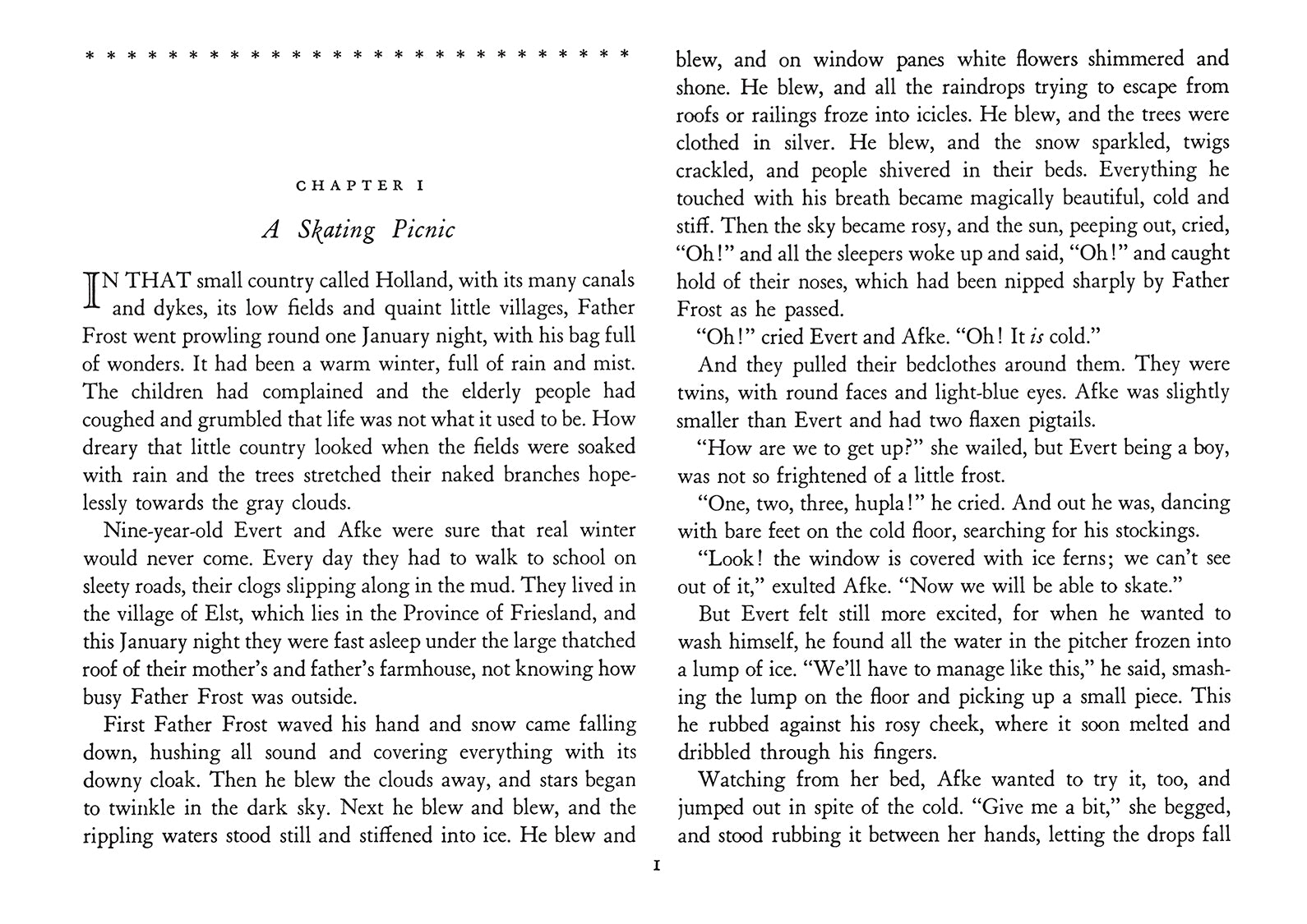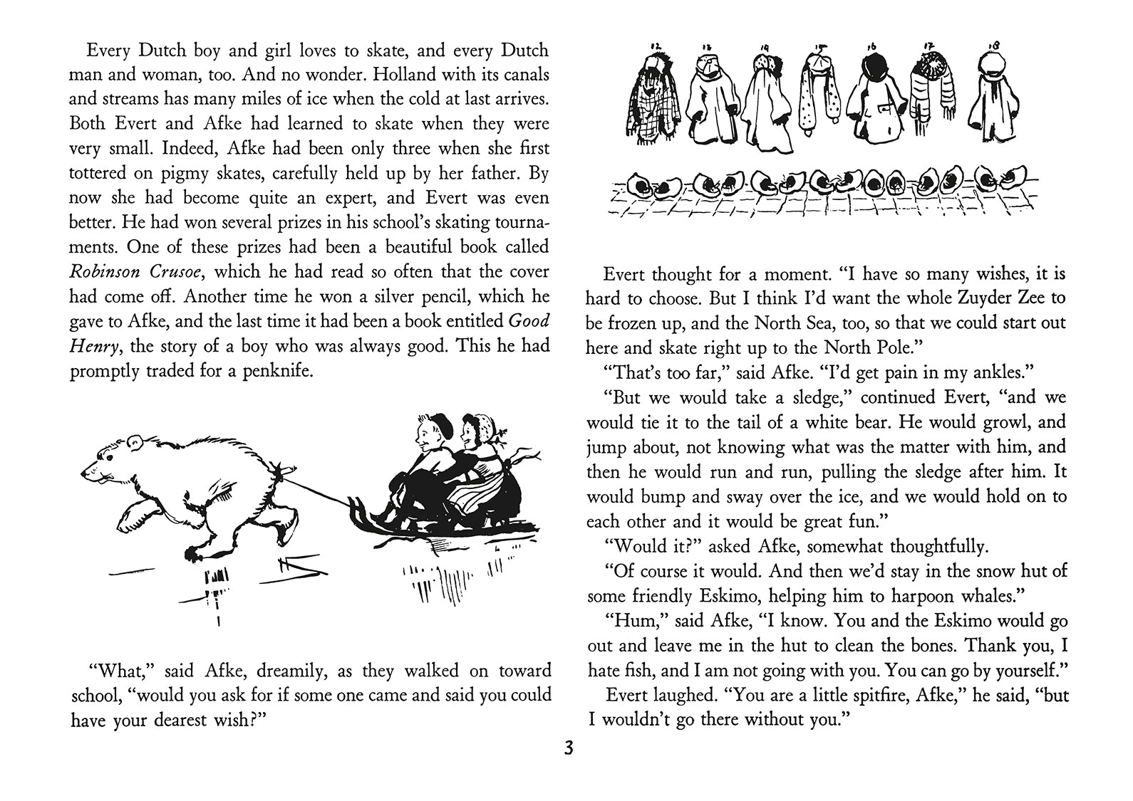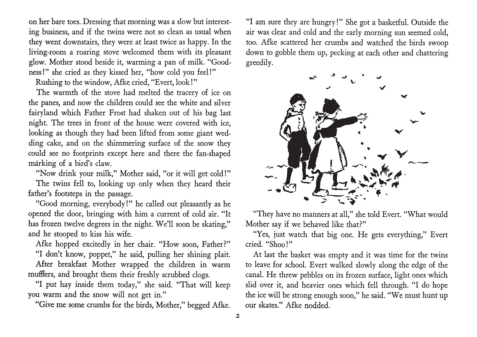With this 1935 Newbery Honor book, author/illustrator Hilda van Stockum made her debut into the world of children’s books. Within its pages she adroitly captures Dutch life as it was in the early part of the last century. To the great excitement of nine-year-old twins, Evert and Afke, winter weather has finally come and the canals are frozen hard and smooth. Luckily, they have an understanding teacher who decides to take his class on an all-day winter skating trip to a nearby town. Evert and his buddies, shy Simon and loyal Afke all have their share of adventures—some amusing, some risky. Everyone (Teacher most of all) breathes a happy sigh of relief upon arriving home safely after a very full day. Seven beautiful full-color paintings and numerous line drawings enliven this 2007 Commemorative Edition.