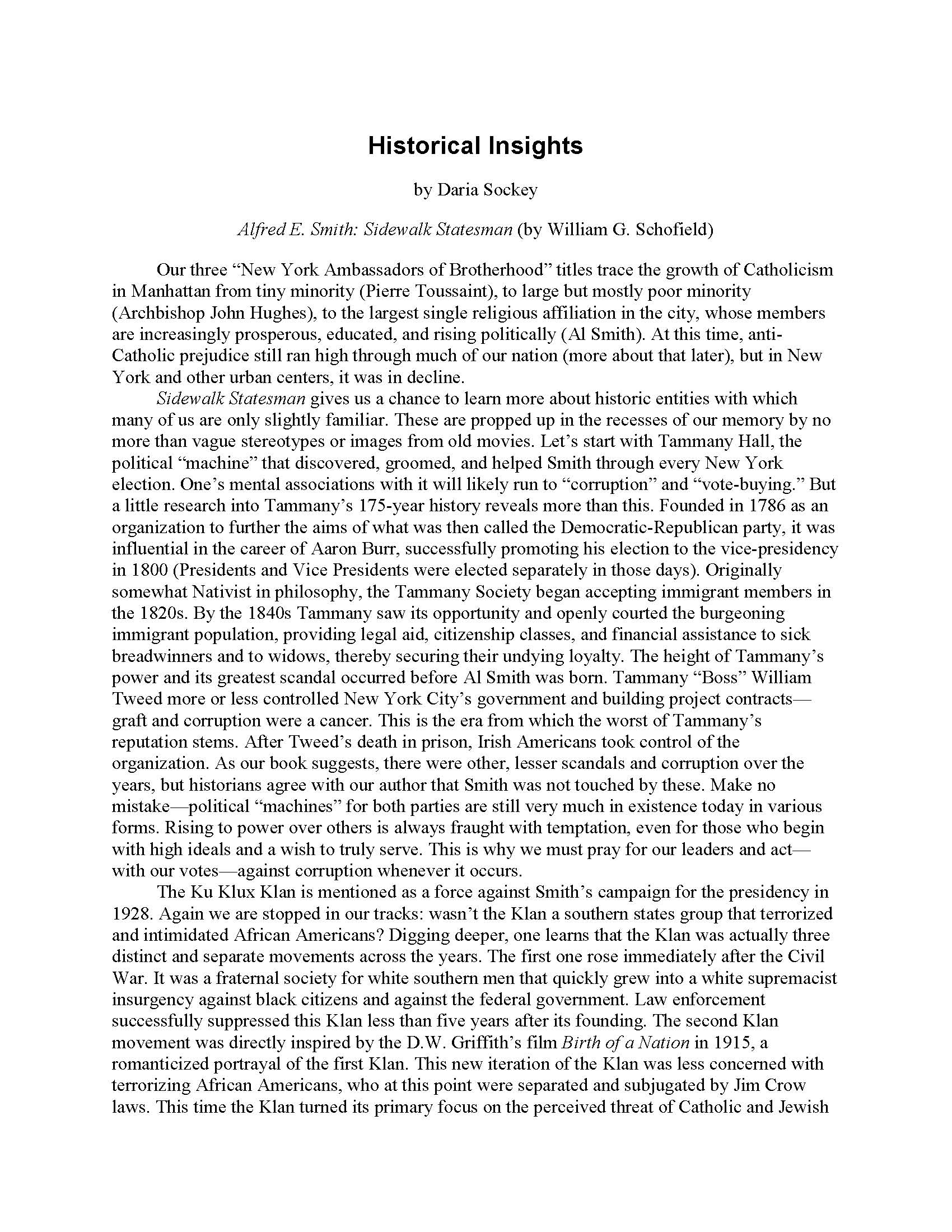 In 1928 Al Smith, acclaimed Governor of New York, is running for president of the United States. His record of political reform and fearless integrity give him a strong chance at winning the presidency. That’s until the Ku Klux Klan and other anti-Catholic groups fan the flames of vague doubts around the country about Al’s Catholic beliefs; they claim that these do not square with the principles of the United States Constitution; that Smith’s allegiance will be a divided one between his nation and the Vatican. What Al spells out for the public in his detailed defense gives food for thought—not just for his time, but particularly for today’s very different conditions.