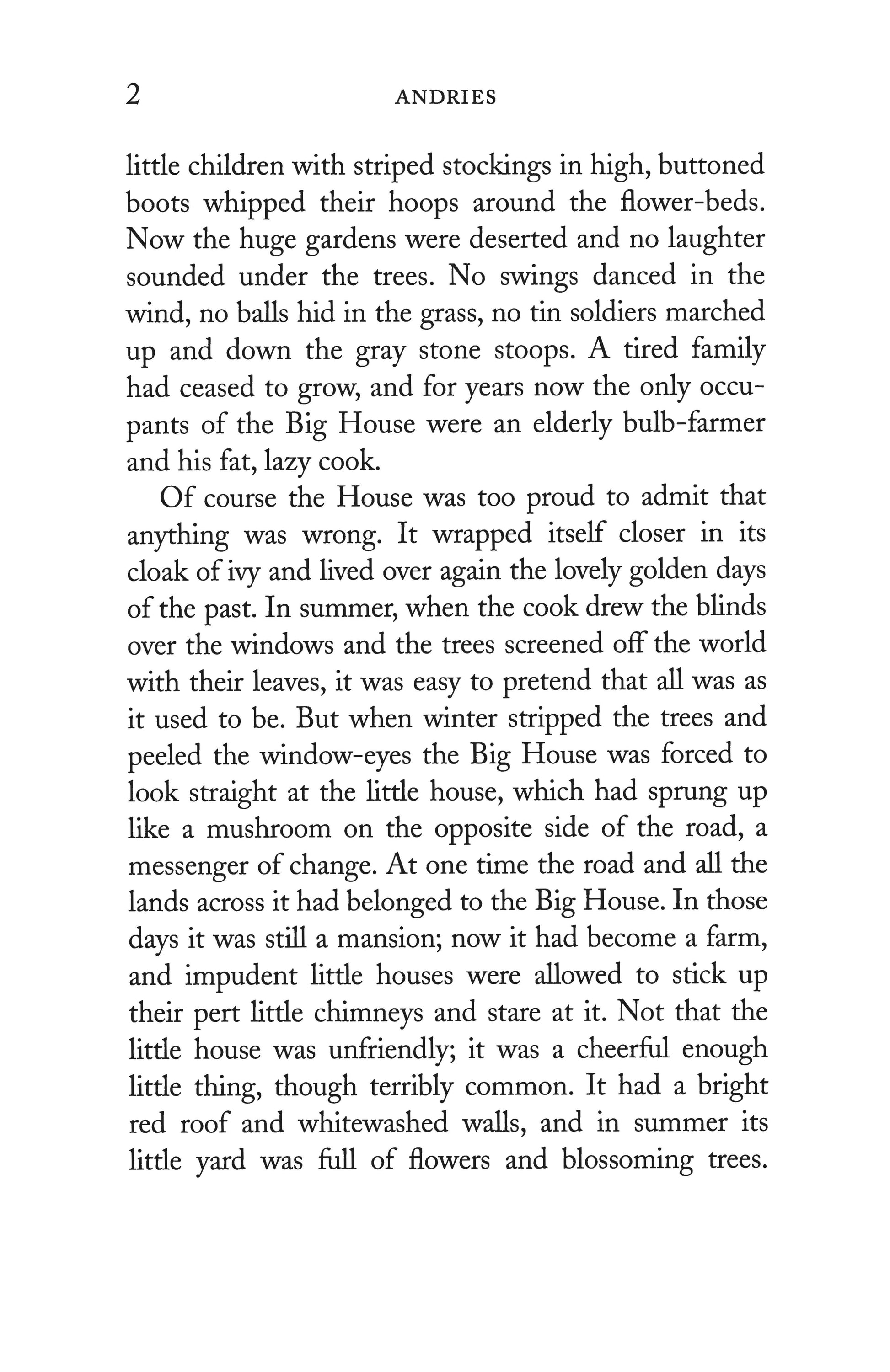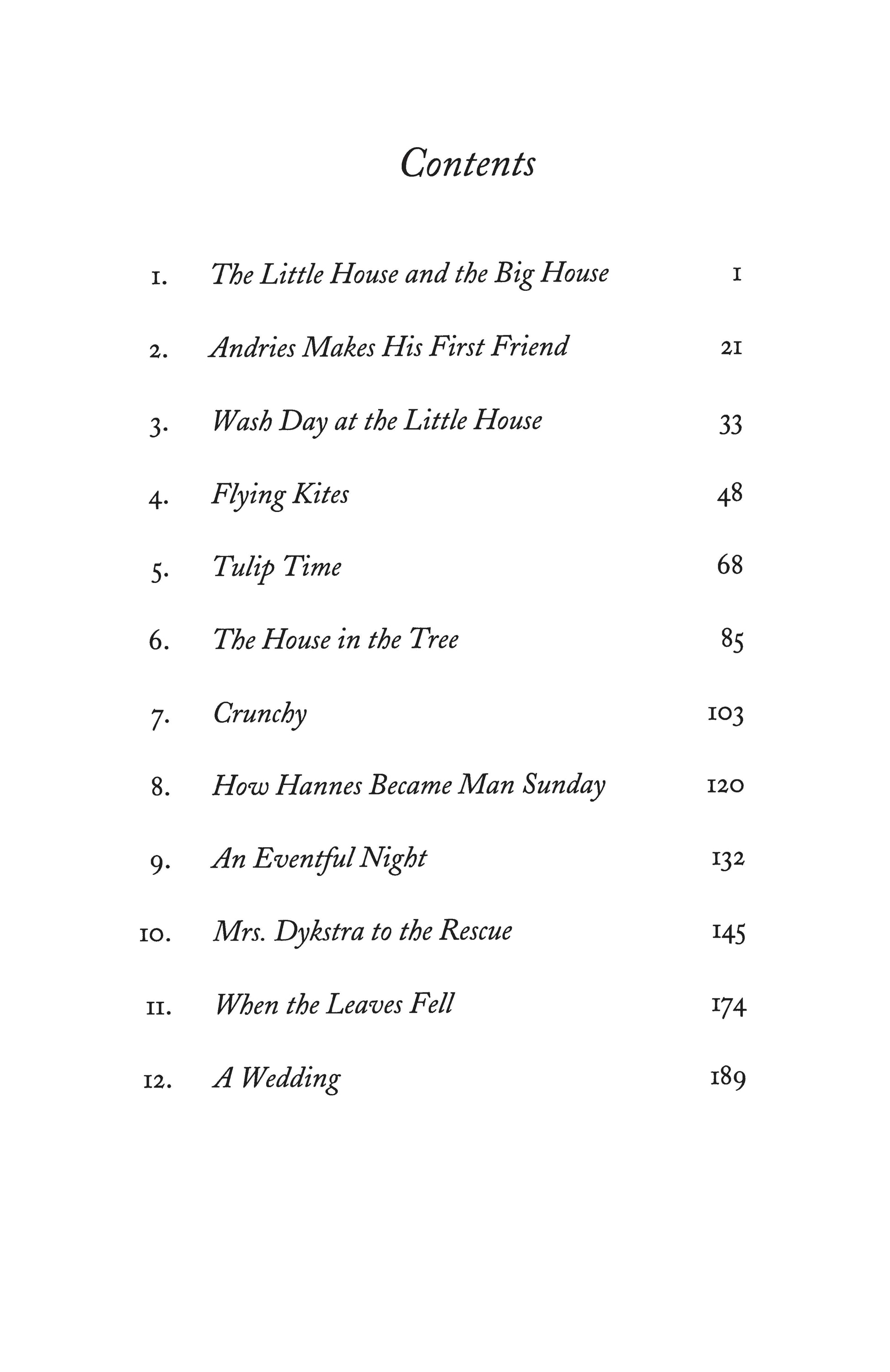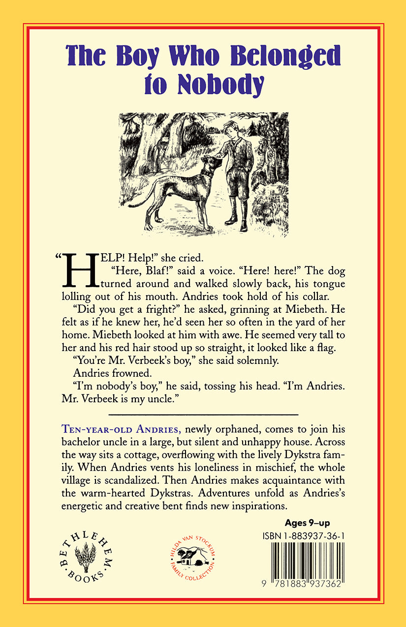 Ten-year-old Andries, newly orphaned, comes to join his bachelor uncle, Pieter Verbeek, in a large, but silent and unhappy house. Across the way sits a cottage, overflowing with the lively Dykstra family. While Father Dykstra works as a wooden-shoemaker, Mother Dykstra oversees the household of four children, practical Helga, dreamy Miebeth, irrepressible Kobus, and baby Treeske. The newly arrived boy rouses the older girls' curiosity, but Mr Verbeek's large dog is a strong deterrent to friendly advances. When Andries vents his loneliness in mischief, the cook, and soon the whole village, is scandalized. Then, through the antics of the very dog that frightens the girls, Andries begins to make the acquaintance of the warm-hearted Dykstras. Adventures unfold as Andries’ energetic and creative bent finds new inspirations. Hilda van Stockum is at her best and most humorous in the dialogues which emerge from friendship and family's many viewpoints.