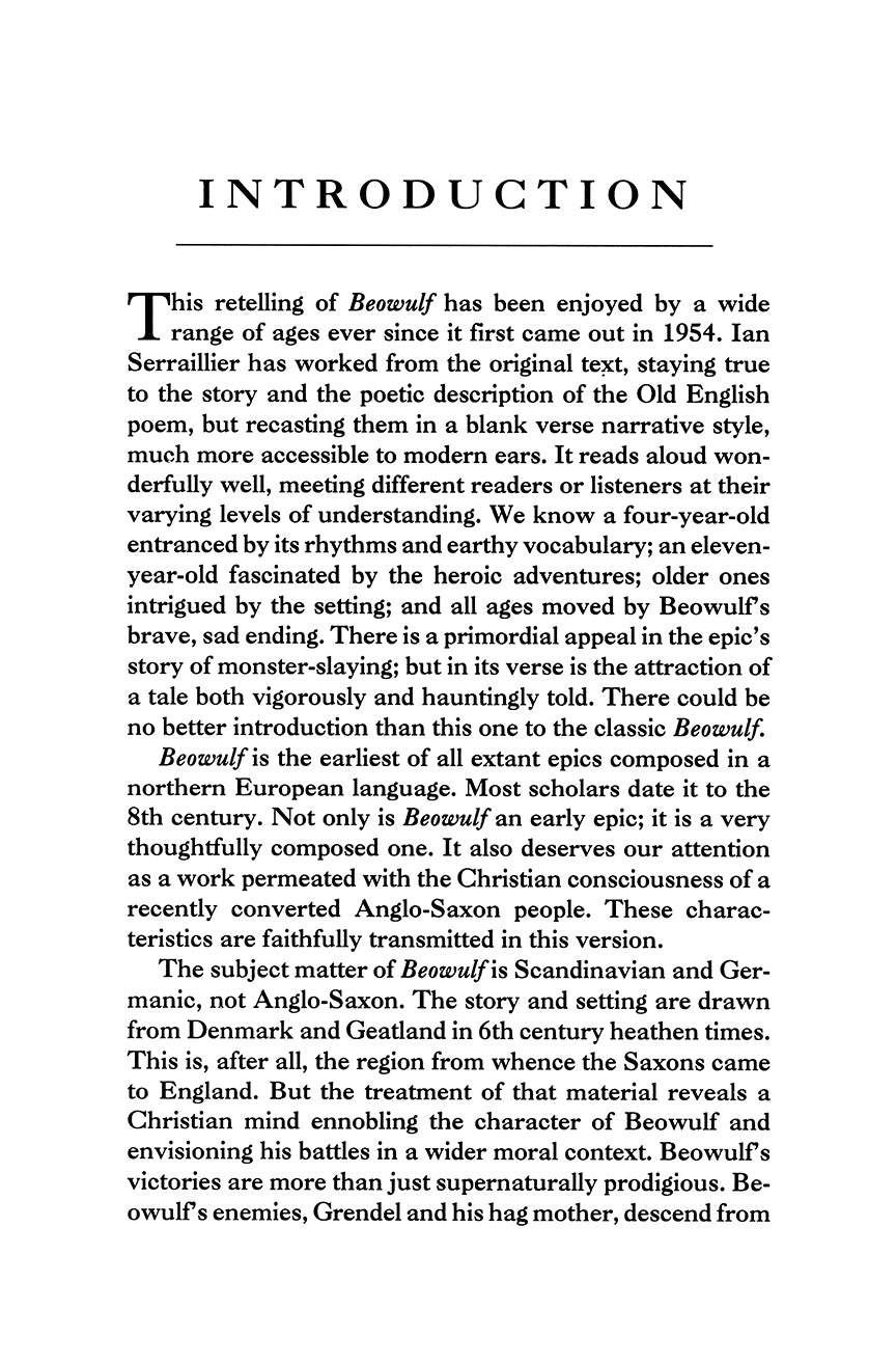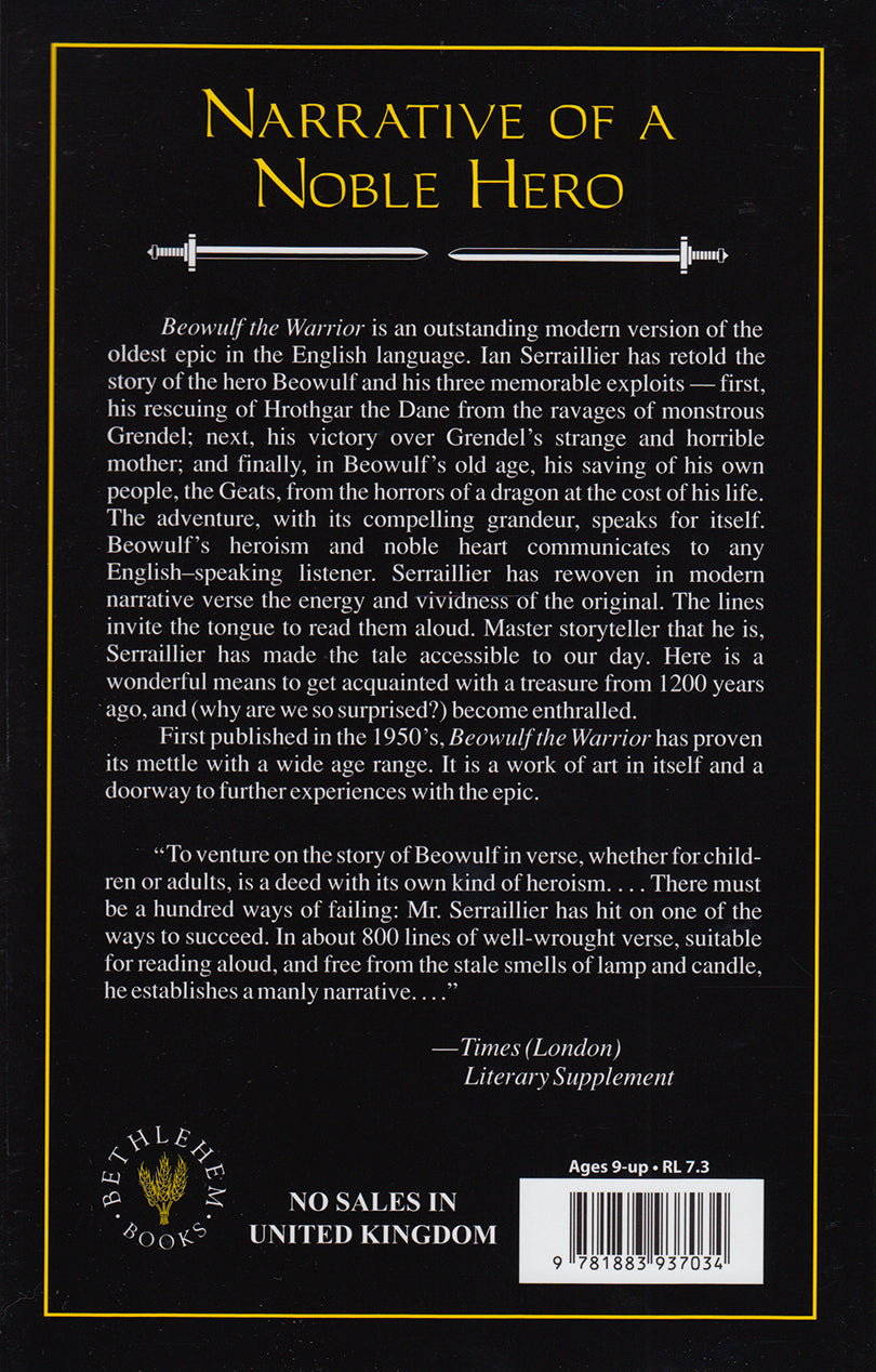 Beowulf the Warrior is an outstanding modern version of the oldest epic in the English language. Ian Serraillier has retold in verse the story of the hero Beowulf and his three memorable exploits—first, his rescuing of Hrothgar the Dane from the ravages of monstrous Grendel; next, his victory over Grendel’s strange and horrible mother; and finally, in Beowulf’s old age, his saving of his own people, the Geats, from the horrors of a dragon at the cost of his life. Beowulf’s heroism and noble heart communicate to any modern listener.