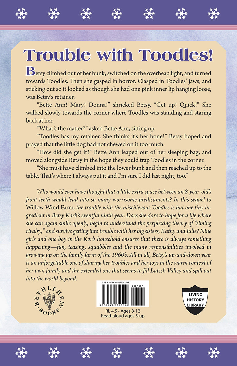 This is the fifth and final book in the Latsch Valley Farm series, recounting the lives of four generations of a Polish-American extended family, living in neighboring homesteads in Wisconsin. A sequel to Willow Wind Farm, we follow Betsy Korb, now aged eight going on nine, as she learns the lessons of sharing, making up after quarrels, running errands and broadening her experiences within her large and loving family, under the firm and wise direction of Mom and Dad and underpinned by their Catholic faith. Told in a highly readable style, the author, Betsy’s aunt, has carefully observed the triumphs and disasters in the life of the inquisitive and independent-minded Betsy as she grapples with the ups and downs of growing up, setting them in the warm context of family life—the Korbs’ own life and the bigger one that seems to fill Latsch Valley and spill out into the world beyond.