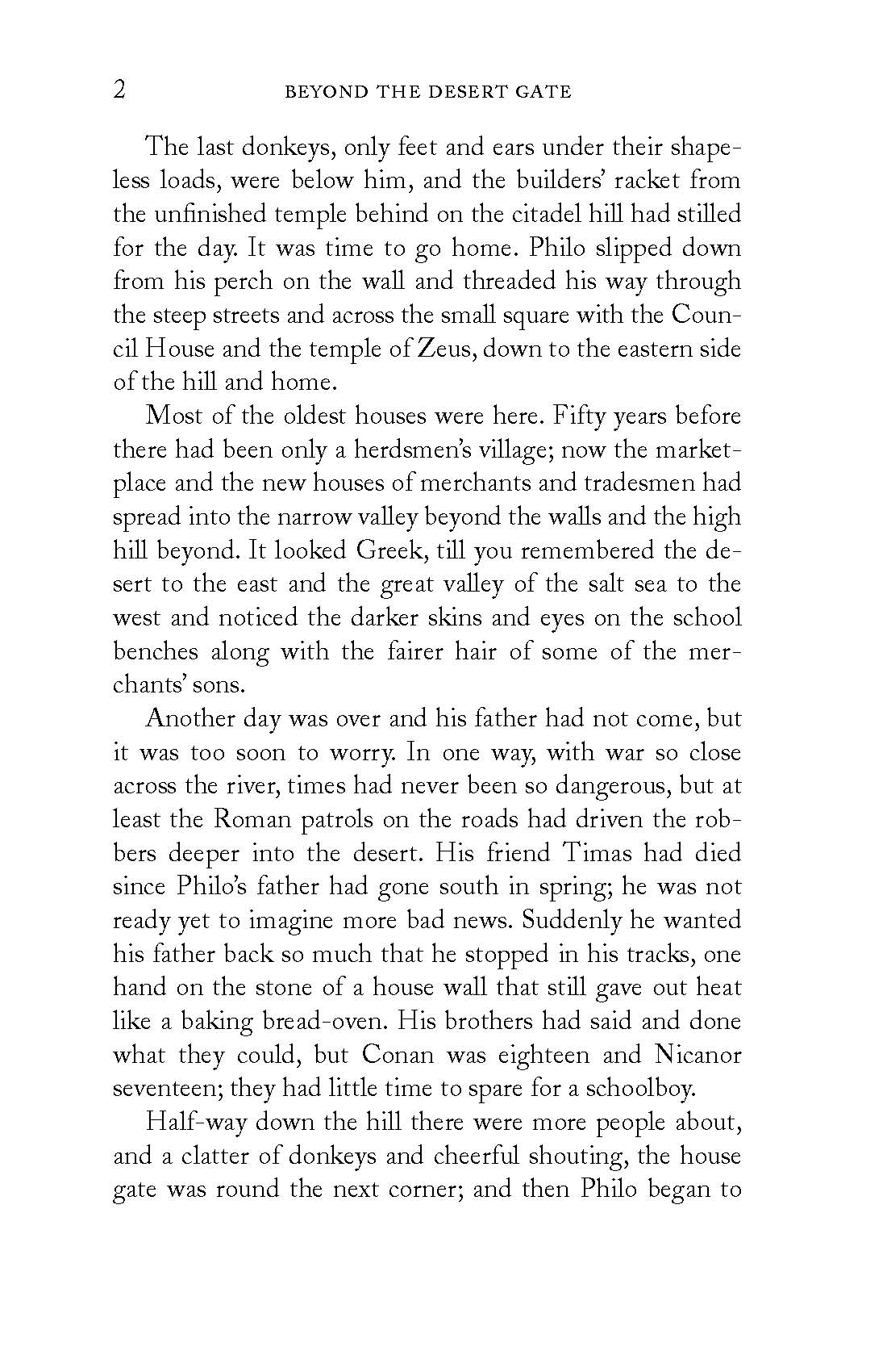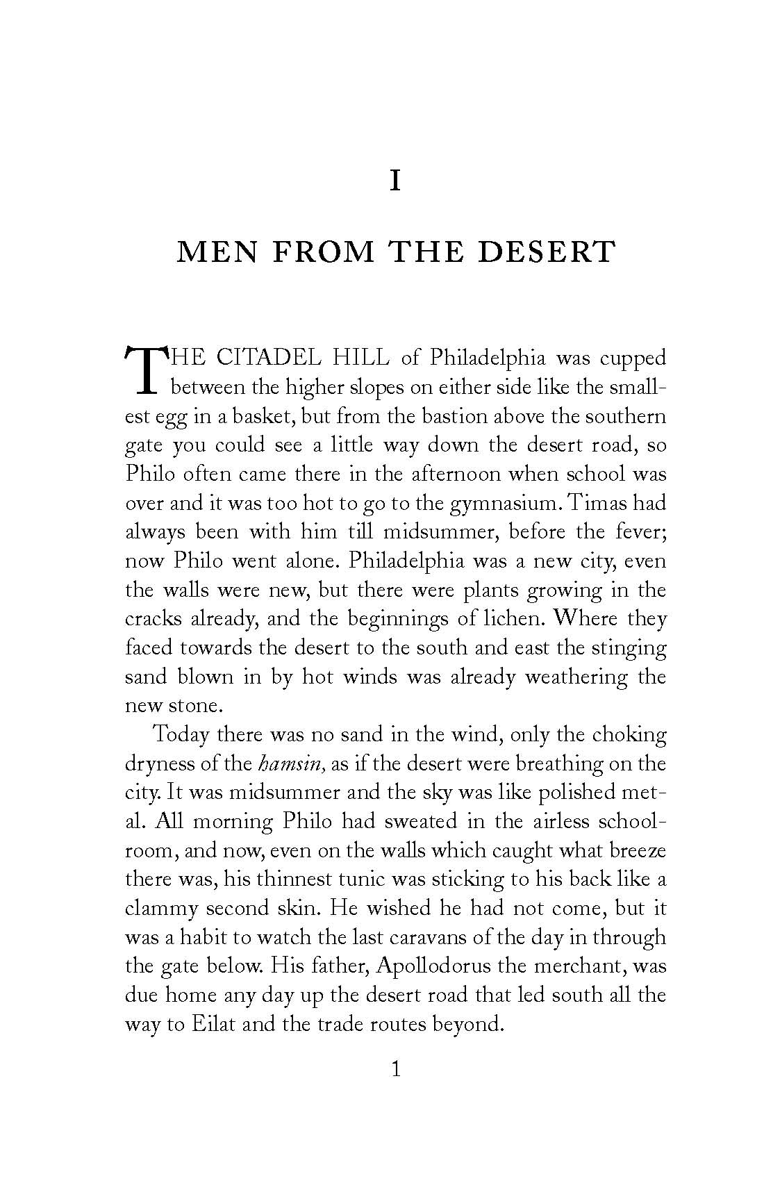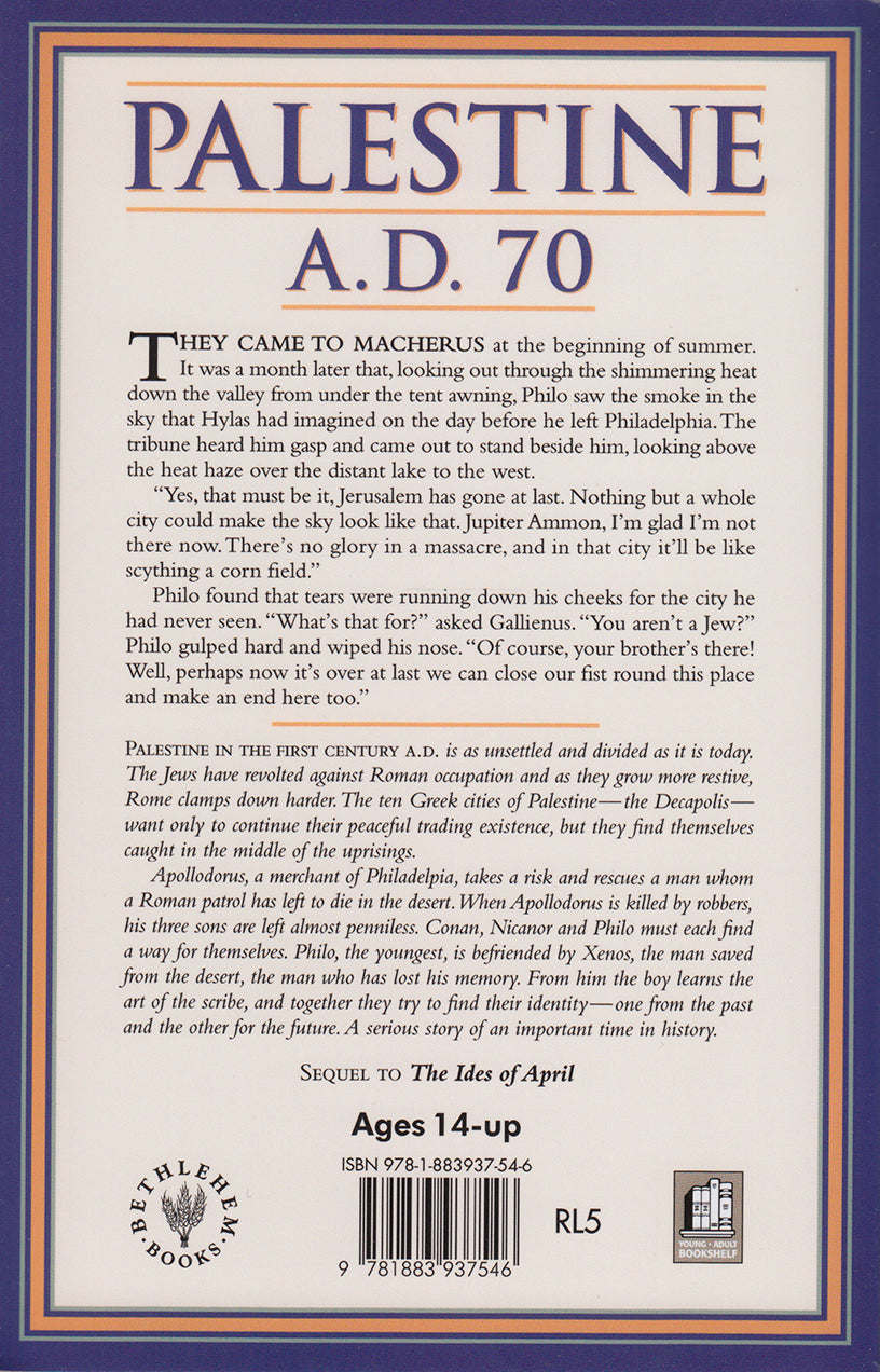 Palestine, first century A.D.—the Jews have revolted against Roman occupation. The ten Greek cities of Palestine—the Decapolis—want only to continue their peaceful trading existence, but they find themselves caught in the middle of the uprisings. Apollodorus, a merchant of Philadelphia, takes a risk and rescues a man whom a Roman patrol has left to die in the desert. When Apollodorus is killed by robbers, his three sons are left almost penniless and must each find a way for themselves. Philo, the youngest, is befriended by Xenos, the man saved from the desert, who has lost his memory. From him the boy learns the art of the scribe, and together they try to find their identity—one from the past, the other for the future. A serious story of an important time in history.