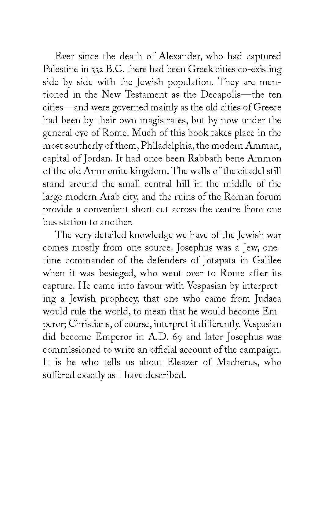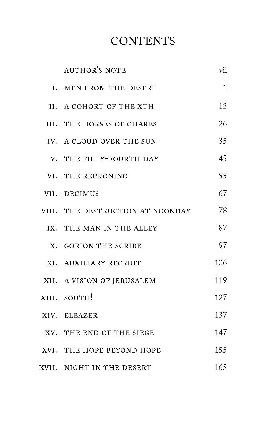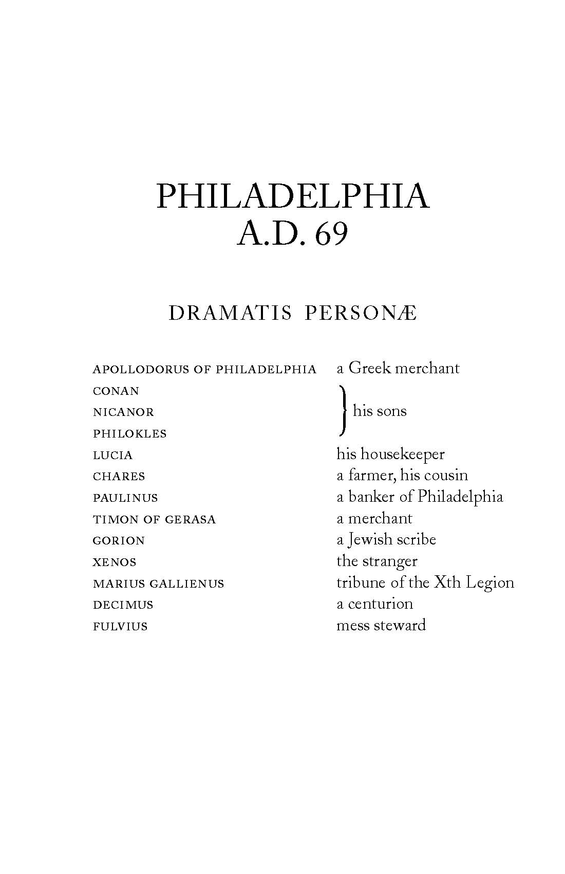 Palestine, first century A.D.—the Jews have revolted against Roman occupation. The ten Greek cities of Palestine—the Decapolis—want only to continue their peaceful trading existence, but they find themselves caught in the middle of the uprisings. Apollodorus, a merchant of Philadelphia, takes a risk and rescues a man whom a Roman patrol has left to die in the desert. When Apollodorus is killed by robbers, his three sons are left almost penniless and must each find a way for themselves. Philo, the youngest, is befriended by Xenos, the man saved from the desert, who has lost his memory. From him the boy learns the art of the scribe, and together they try to find their identity—one from the past, the other for the future. A serious story of an important time in history.