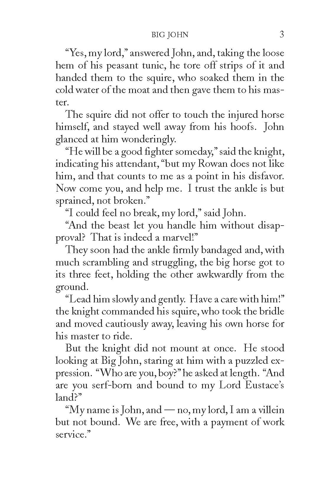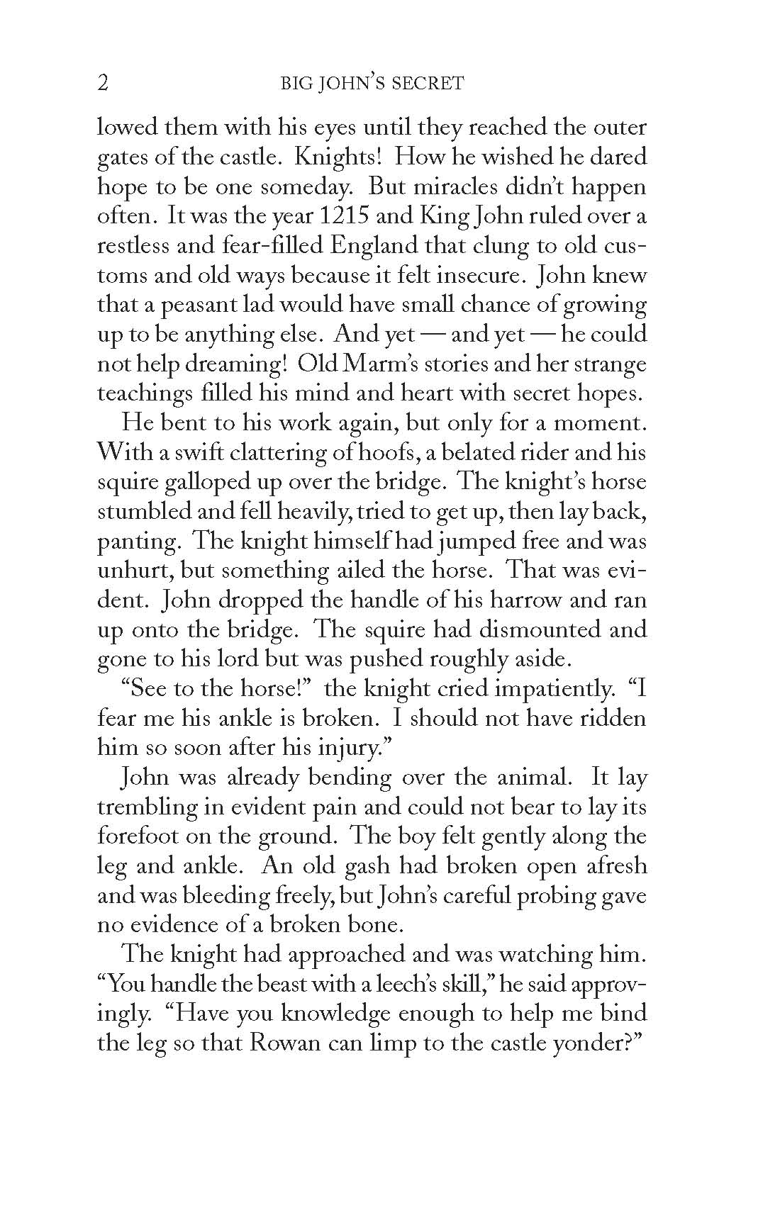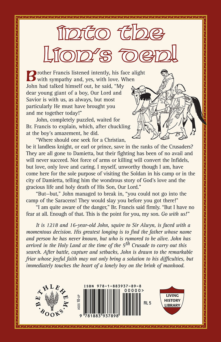 Mystery surrounds the young peasant boy known as Big John. Raised during the strife-filled days of the reign of King John of England, his life is one day changed when a knight says, in passing, “You remind me of someone—someone I once knew and loved.” It is from “Old Marm,” the herb woman, that John understands that injustice has been done his family. Though never telling him the family name lest he unwittingly betray himself, she does all she can to prepare him to one day reclaim his name and family honor. Then Old Marm dies, and John is left without a clue to his identity. In the next years John’s unusual size and strength and the knowledge he has gained of letters and of the art of healing earn him a place as page to an earl organizing the 5th Crusade. In the Holy Land John searches for a father he hopes is living still. Amidst battle, capture and setbacks, John—now a squire to a Knight Hospitaller—encounters Francis of Assisi, who had come to the Holy Land just at this time to preach the Gospel to the Saracens. It is another meeting that changes the course of Big John’s life.