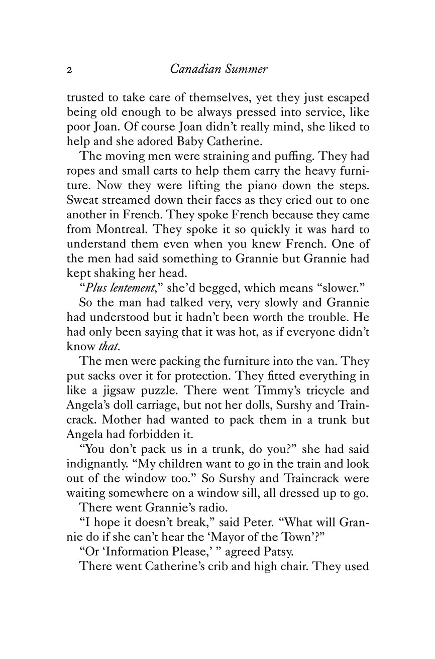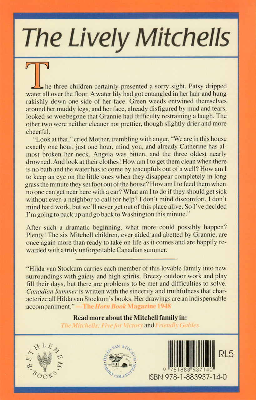 The large and growing Mitchell family, transferring their location to Montreal, can’t find a house to buy or rent. They settle, over Mother’s protests, for a remote, rickety summer house in the woods near a lake. The dangers, antics, quarrels, and fun which now unroll bring each member of the family into vivid characterization. Meanwhile we meet some delightful French Canadians and taste the special qualities of rural Quebec in the late 1940’s.