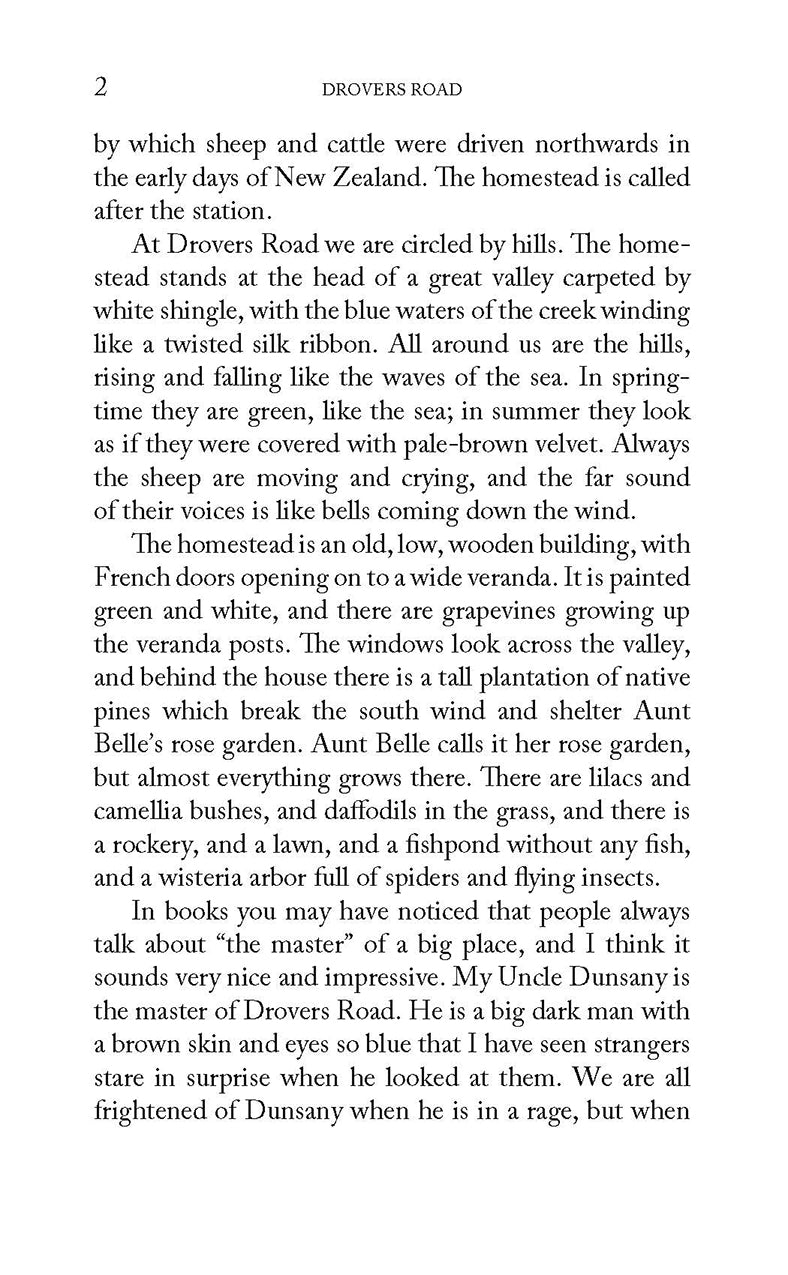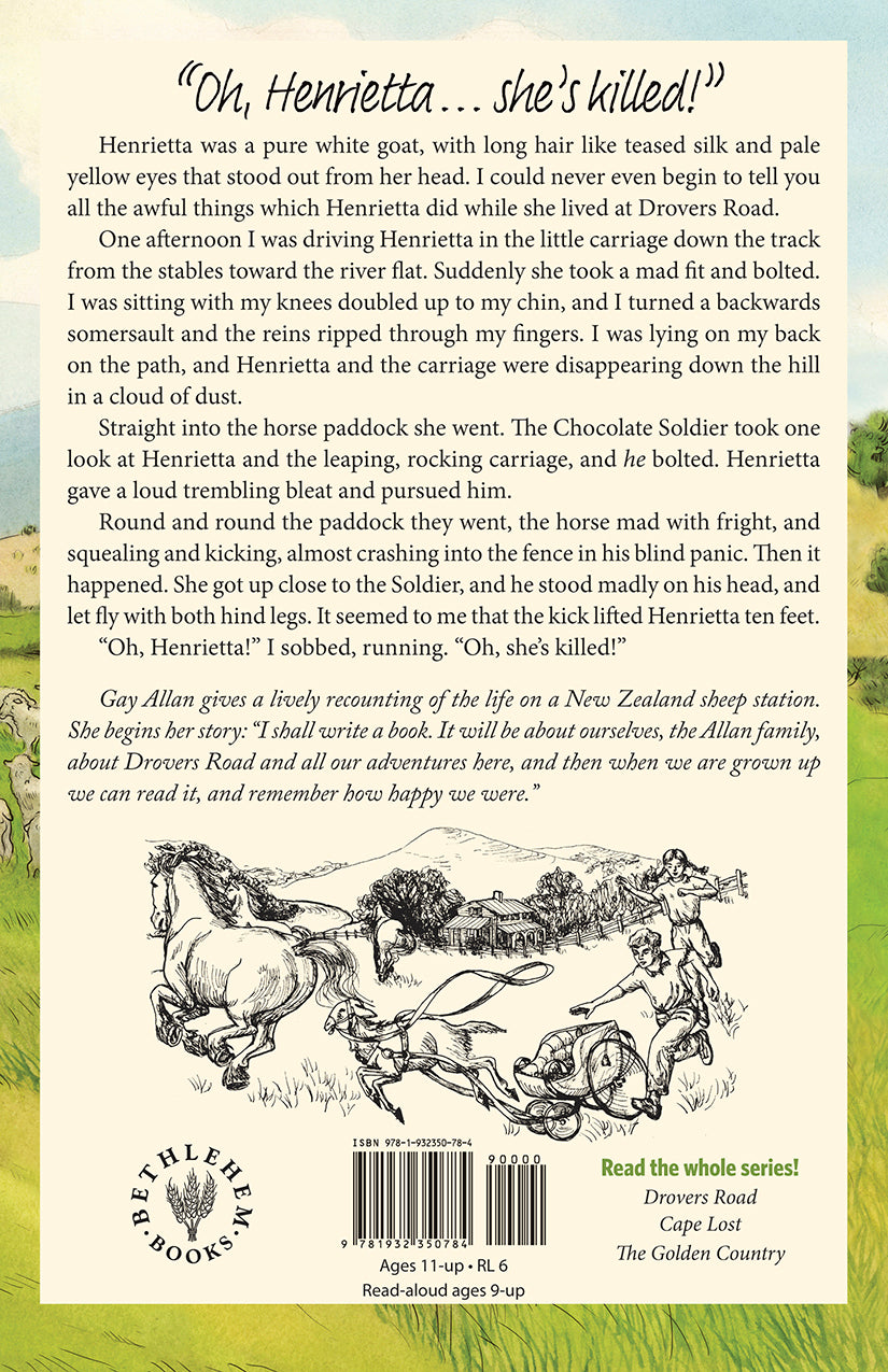 Through vivid characterizations of people and place, Joyce West’s storytelling draws her reader into the richly-textured, rural setting of New Zealand in the mid-20th century. In this first book, young Gabrielle Allan (called Gay) is living contentedly on Drovers Road, her Uncle Dunsany’s sheep station in the hill country a hundred miles from Gisborne. Besides her young bachelor uncle there are her three orphaned cousins—Eve, Hugh and Merry—and their Great-Aunt Belle. Taken in by Dunsany years before, after her parents’ divorce, Gay now scarcely remembers any other life. There are lessons at the local school, taught by pretty, sensible Susan Leigh, regular chores, plenty of horse riding and jumping, and pranks with Merry. Amid unforgettable characters, careless actions and scary consequences, young Gabrielle learns and grows, ever thankful for the shared ups and downs of the unconventional, caring family she has been given.