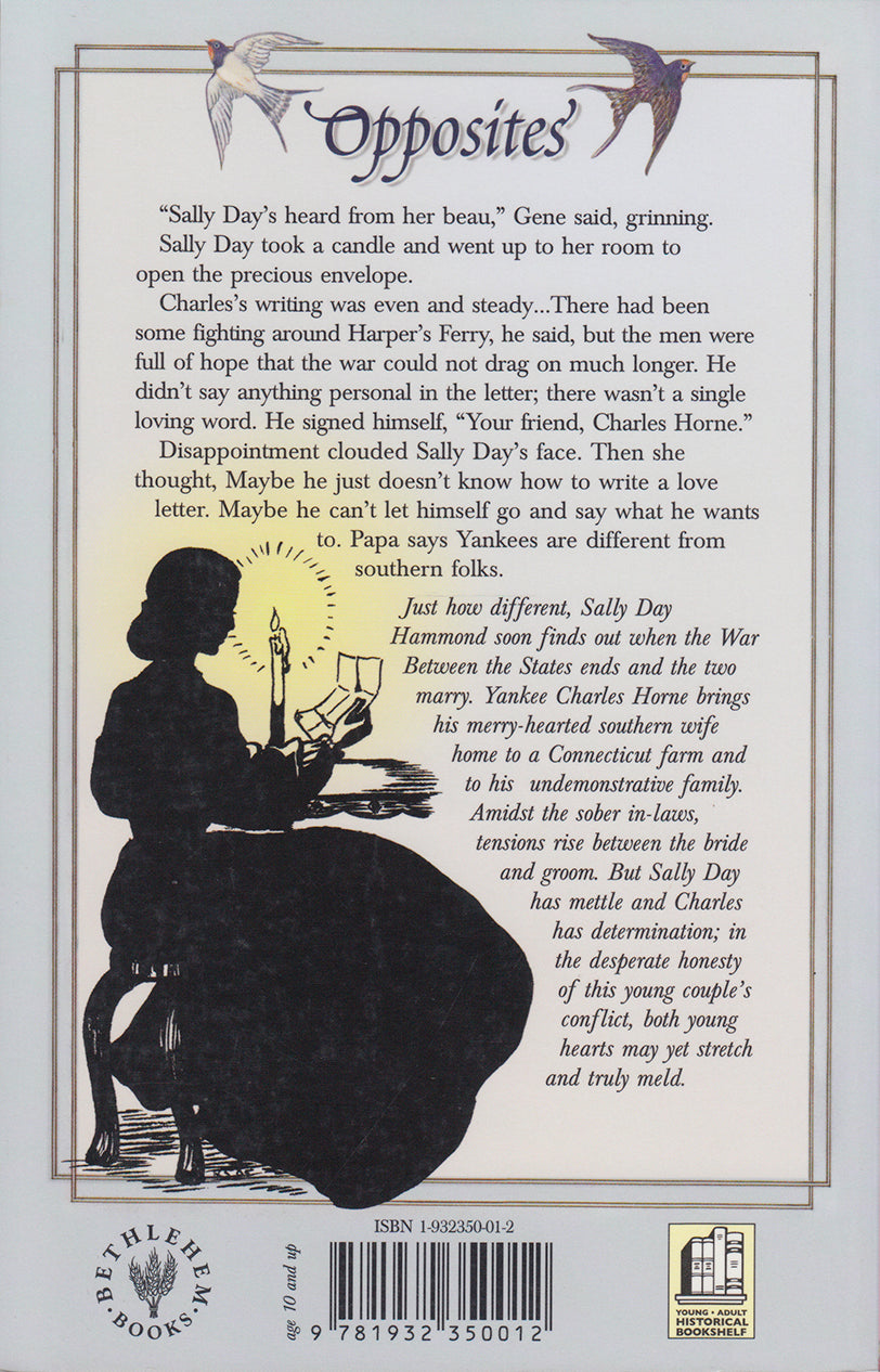 Opposites: Sally Day Hammond is vivacious, tiny, coddled and Southern; Charles Horne is silent, tall, unbending and Northern. The American Civil War has just ended. And a marriage is to be made between these two? When Charles brings Sally Day back to live with his strict New England family, little wonder that tensions rise to the breaking point. But Sally Day has mettle; in the desperate honesty of this young couple’s conflict, both young hearts may yet stretch and truly meld. In a setting of historical depth, skilled novelist Bianca Bradbury brings all the resources of a heart-searching realism to the predicaments of young married love.