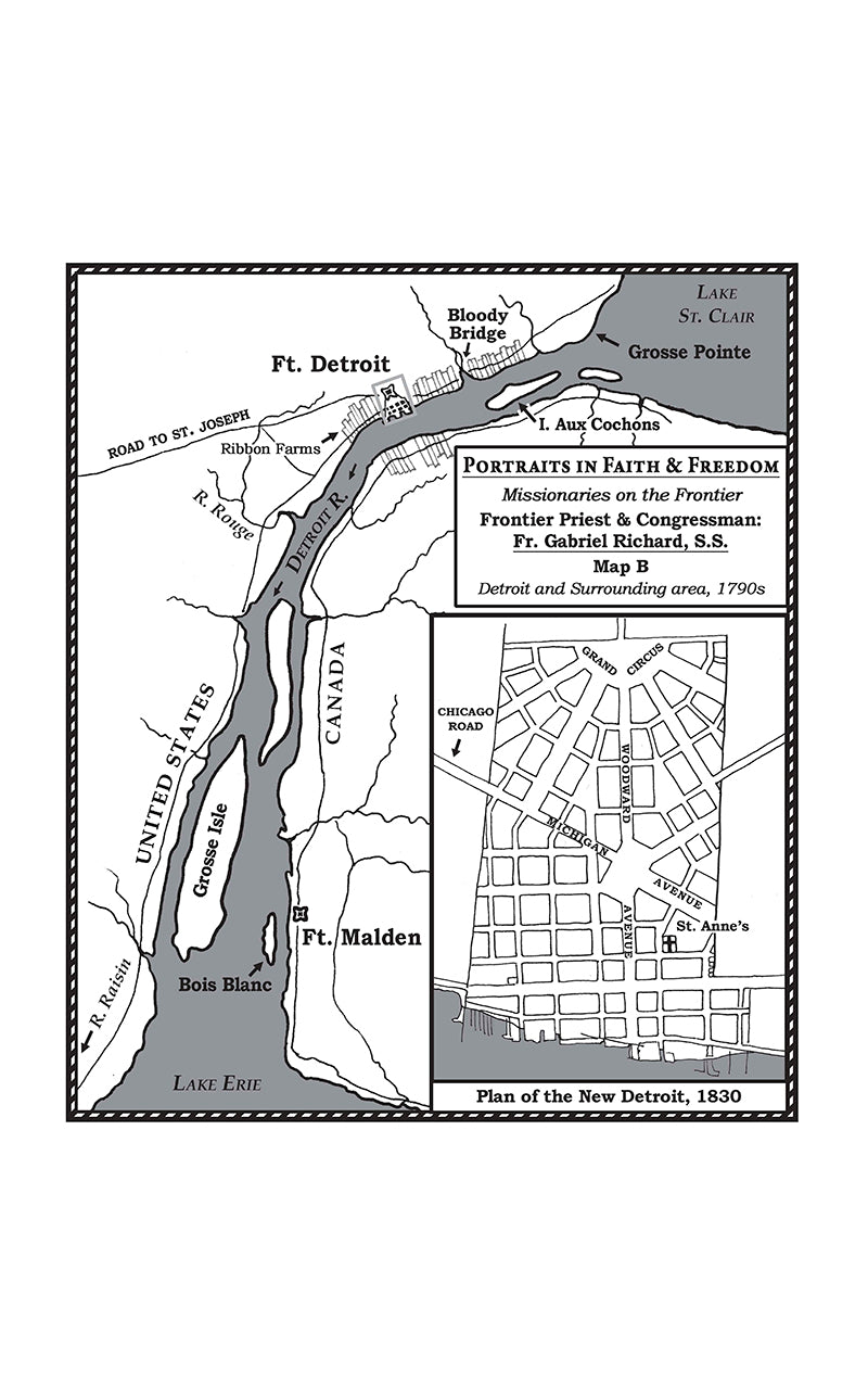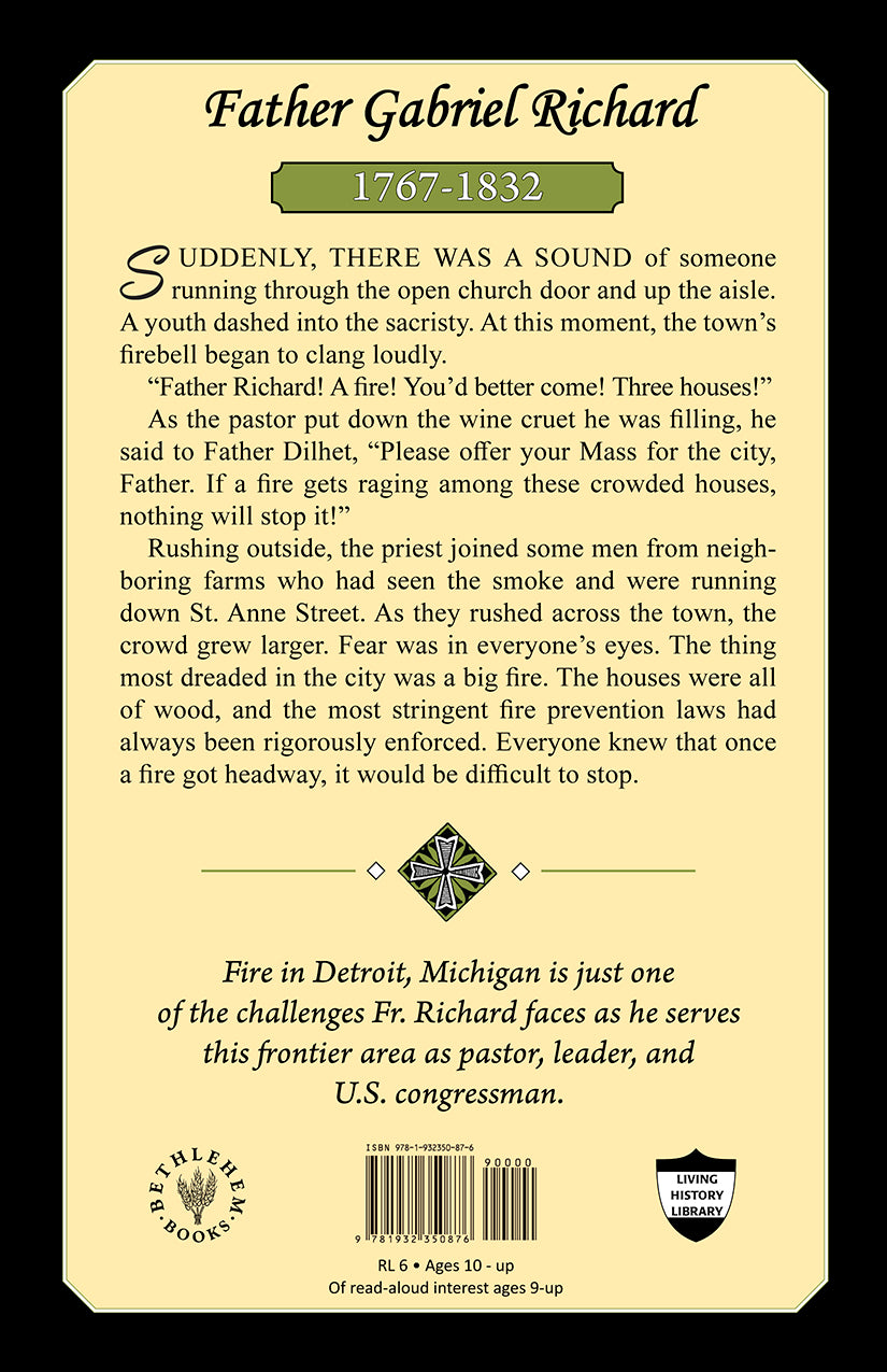 A heroic priest meets frontier Detroit: readers are assured of a colorful encounter. The priest is Father Gabriel Richard, who was born in France in the latter half of the 18th century and had experienced the many horrors of the French revolution. After his ordination as a Sulpician priest in 1791, he himself becomes a fugitive and is forced to flee to America. Instead of his intended role of training seminarians, Fr. Richard is sent to the key city of Detroit, becoming responsible for Catholics throughout the Michigan wilderness. Here he pours out his energies for the next three and a half decades. The needs that he finds among Detroit’s French, English and native peoples draw forth from his teeming mind a host of plans and hard-won achievements: schools, churches, a newspaper and many social initiatives, even federal help from Congress. Amidst fire, disease, war, and stubborn frontier settlers, Fr. Richard endures humiliations while becoming in fact a friend to all. Fr. Gabriel Richard’s story shows the life of a man who through his devotion to the Church did outstanding work in helping to establish the American nation.
