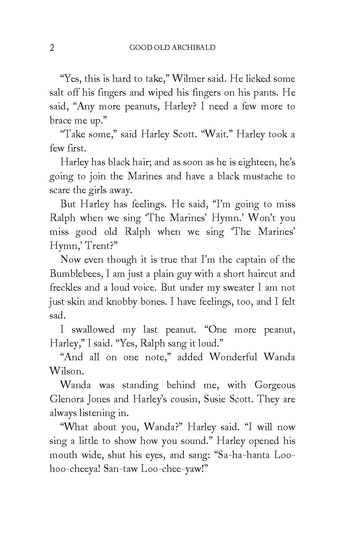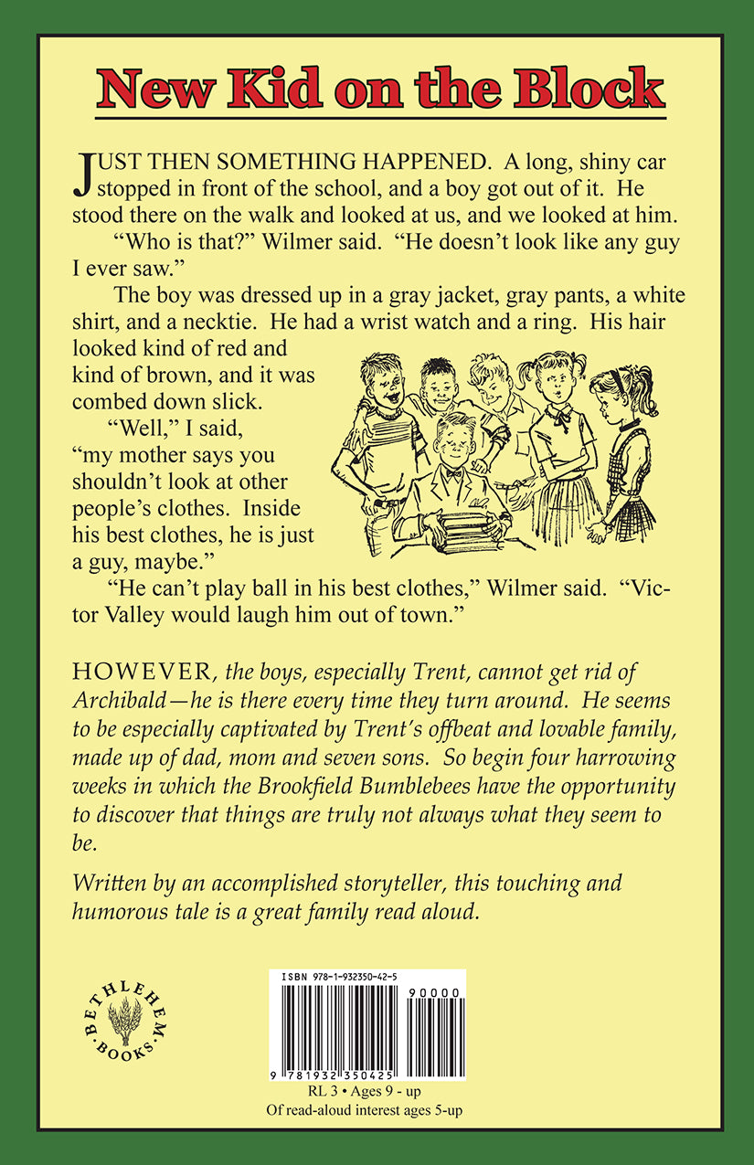 In this amusing story—that is both slightly vintage and completely timeless—good old Ralph Jackson has deserted Brookfield School (his family has had to move to another city) just four weeks before the “picnic day” baseball game against the Lawson Lions. His buddies Trent, Wilmer and Harley are not happy, but they get only gleeful heckling, rather than sympathy from classmates Wonderful Wanda, Gorgeous Glenora and Susie Scott. The dismal situation is not improved by the arrival of a new boy, Archibald Brewster, who wears a suit and tie and is taken to and from school by a chauffeur—he is NOT the answer to the Brookfield Bumblebees’ prayers. However, the boys, especially Trent, cannot get rid of Archibald—he is there every time they turn around. He seems to be particularly captivated by Trent’s offbeat and lovable family made up of dad, mom and seven sons. So begin four rather harrowing weeks in which the Brookfield Bumblebees have the opportunity to discover that things are truly not always what they seem to be. Written by an accomplished storyteller, this touching and humorous tale is a great family read-aloud.