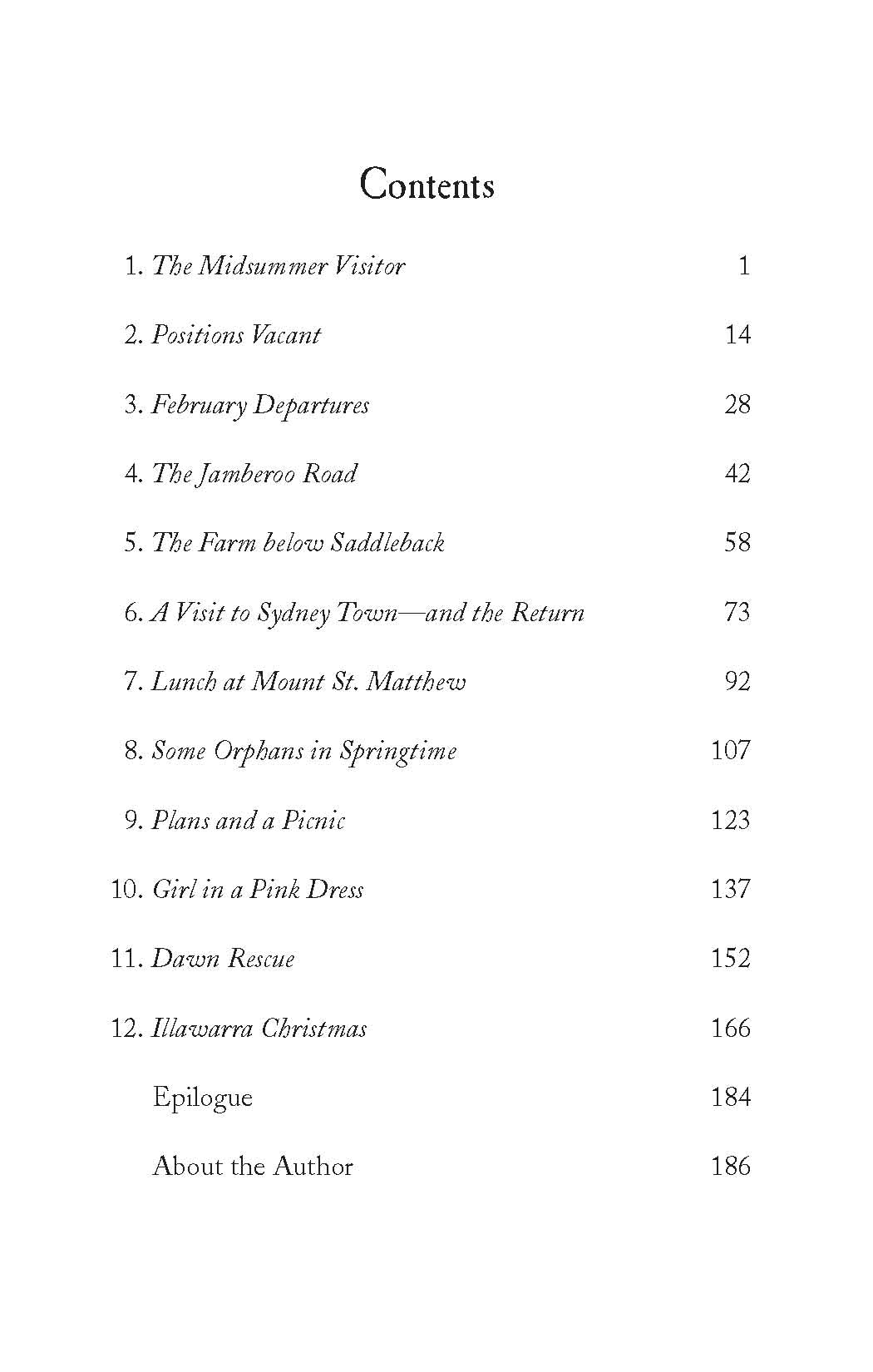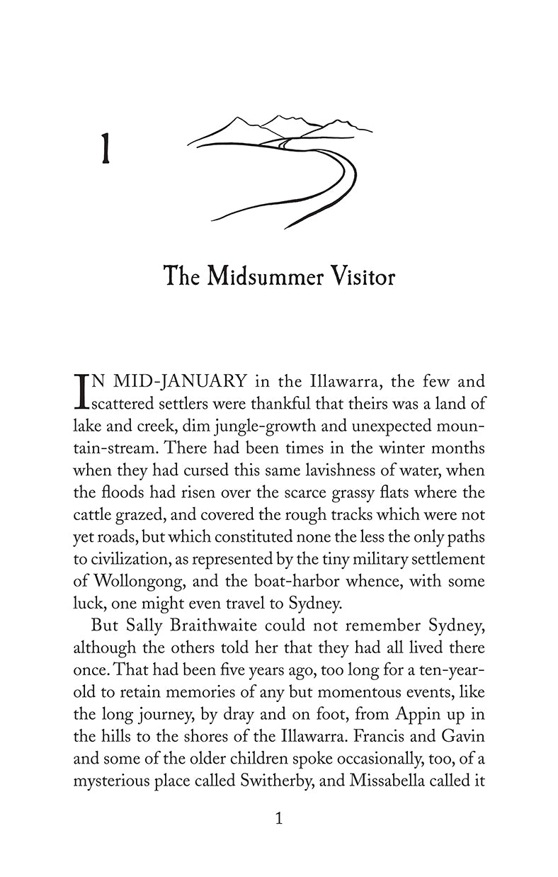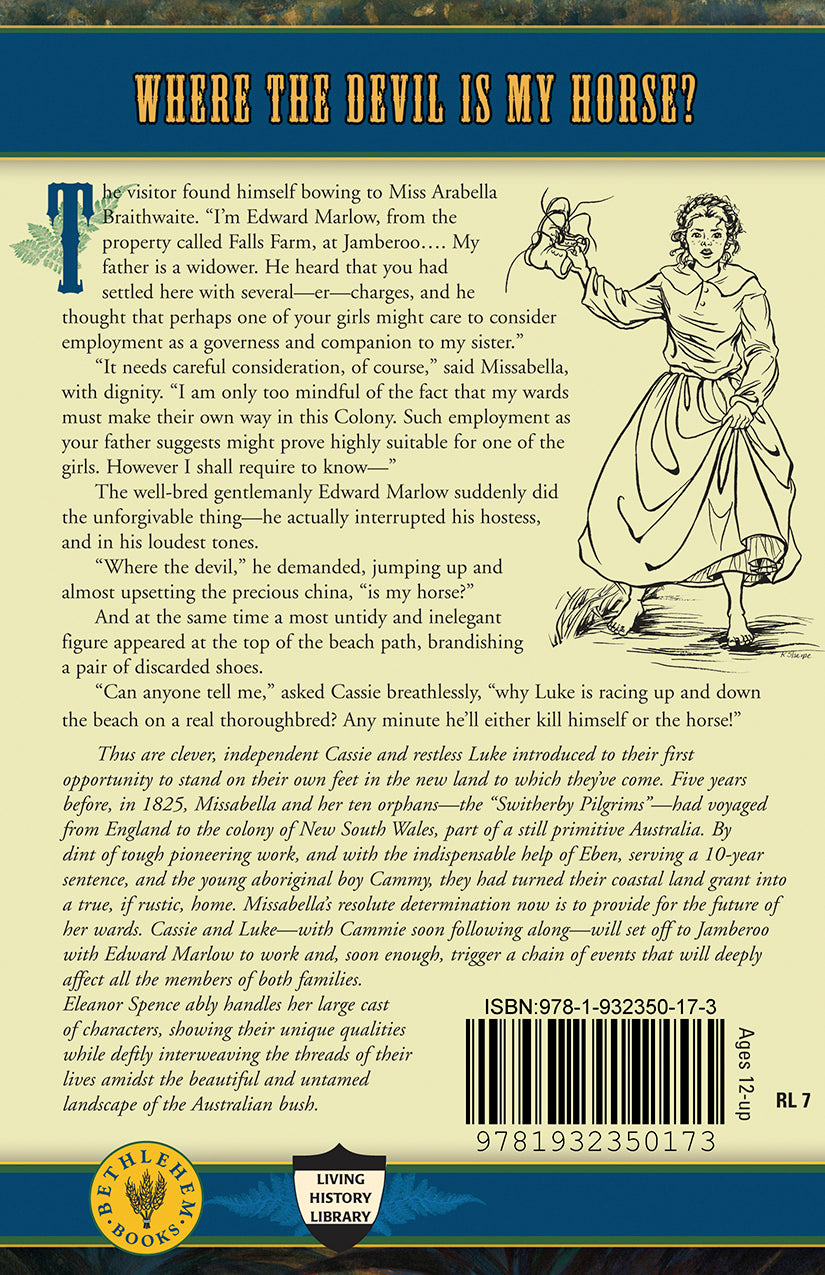 Five years ago, in 1825, Missabella and her ten orphans—the “Switherby Pilgrims”—had voyaged from England to New South Wales, in primitive Australia. By dint of tough pioneering work they had turned their coastal land grant into a true, if rustic, home. Missabella, now, is determined to provide for the future of her orphans according to each one’s character. Not an easy task, with such a varied, ragtag, yet lovable set of personalities and backgrounds as they represent. Selina will train in Sydney to be a milliner; Paul may become a midshipman; Francis loves to farm. But what will satisfy clever, independent Cassie, who has ambitions to be a writer? The “Jamberoo Road” leads her inland, to the discomforts and enticements of being governess in a wealthy colonial family. There restless Luke, likewise employed by the family as a stable boy, will create his own troubles. Cassie’s story, interwoven with Luke’s and that of all the other orphans’ and their former farmhand Eben’s, is both an account of personal growth and a vivid journey into early-day Australia.