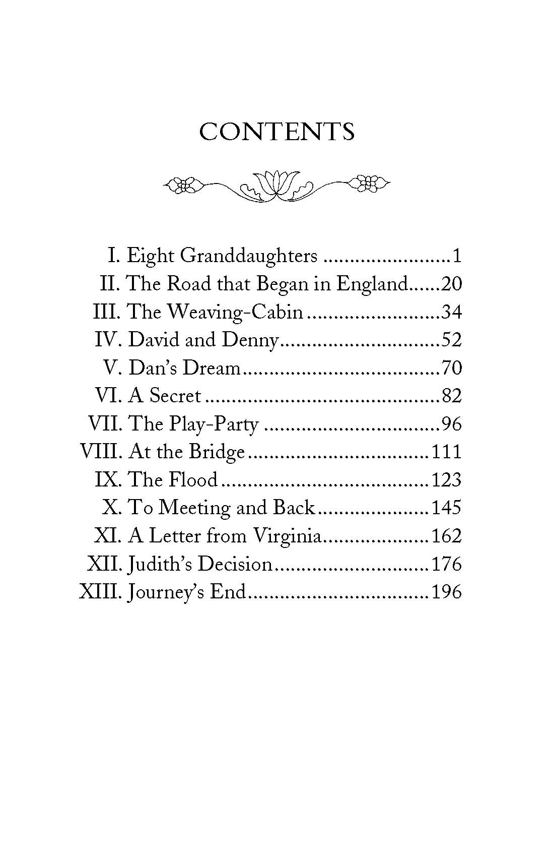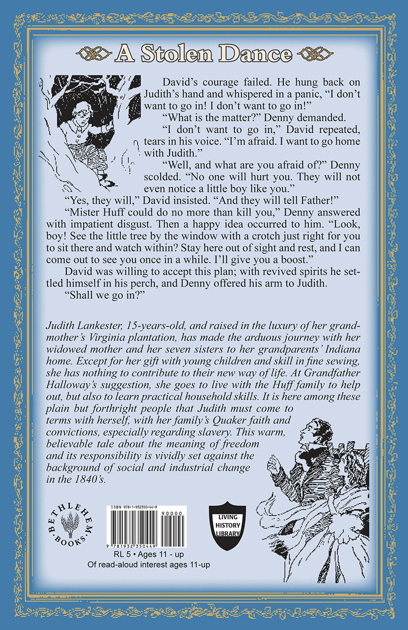 Judith Lankester, 15 years old, and raised in the luxury of her grandmother’s Virginia plantation, has made the arduous journey with her widowed mother and her seven sisters to the home of her grandparents in Indiana. Though her mother, Charity, had married away from the Quaker lifestyle, she had always maintained her faith and convictions. After her husband’s death, she freed his slaves, settled them on their own land and used the last of the family’s resources to travel to Indiana. Welcomed in Grandfather Halloway’s home, Charity hopes to set up her loom and begin weaving cloth to sell. The older girls—all except for Judith—also wish to help. The rawness of the pioneer dwellings and way of life offend Judith’s love of beauty and refinement. She wants to return to the silk and elegance of her grandmother’s home. Except for her gift with young children and skill in fine sewing, she has nothing to contribute to their new way of life. At Grandfather Halloway’s suggestion, she goes to live with the Huff family to help out, but also to learn practical household skills. It is in this kindly crucible that Judith must come to terms with herself, with her family’s Quaker faith and convictions—especially on the subject of slavery—and of where, and with whom, she will spend her future years. This warm, believable tale about the meaning of freedom and its responsibility is vividly set against the background of social and industrial change in the 1840’s—in the period leading up to the American Civil War.