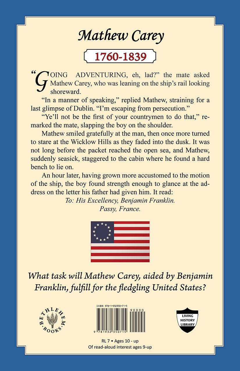 Semi-crippled and with a poor school record, Mathew Carey should never have succeeded in anything, especially as he was also a Catholic in the intolerant Ireland of 1775. But by the age of 15 he’d gotten himself apprenticed to a Dublin printer and bookseller. At 17, he had anonymously penned an incendiary pamphlet entitled The Urgent Necessity of the Repeal of the Penal Code against Roman Catholics, and had to escape to France. There, meeting Benjamin Franklin, he gained a friend and ally. In 1784, fleeing Ireland a second time, he landed in Franklin’s hometown of Philadelphia—the perfect place, at the perfect moment. With the Constitutional issue being debated daily in the State House, Carey listened in on every session, memorizing the argued points to print in his newspaper, effectively defending the necessity of a strong Constitution. So began a long and fruitful career of printing, publishing and bookselling, always on behalf of the important issues being debated in the fledgling nation. A faithful Catholic and family man, Mathew Carey’s strong sense of justice, exceptional memory and verbal gifts, his generosity and diligence (and a flare for colorful adventures) all contributed to the part he played in the founding of the brand new United States of America.