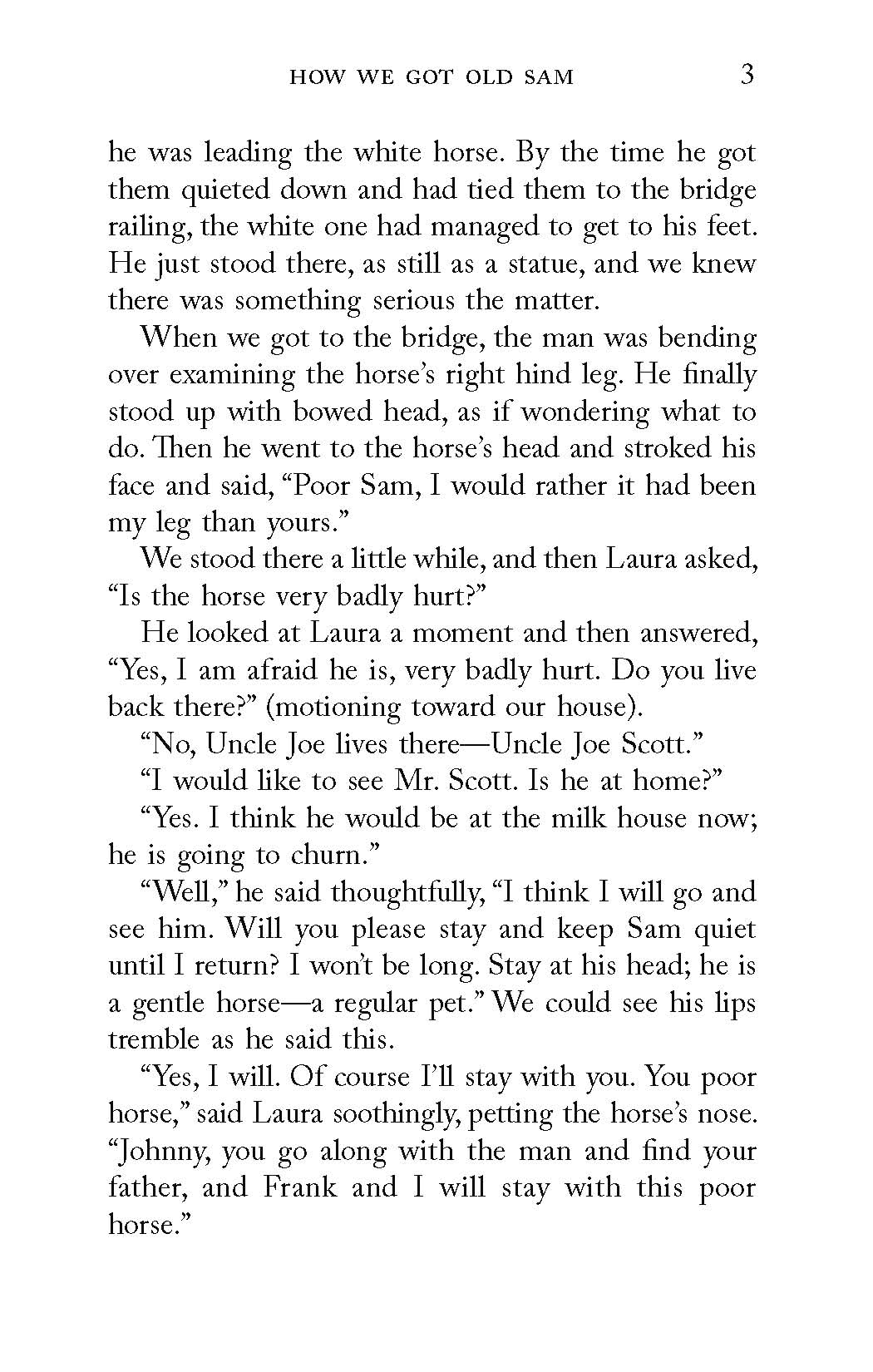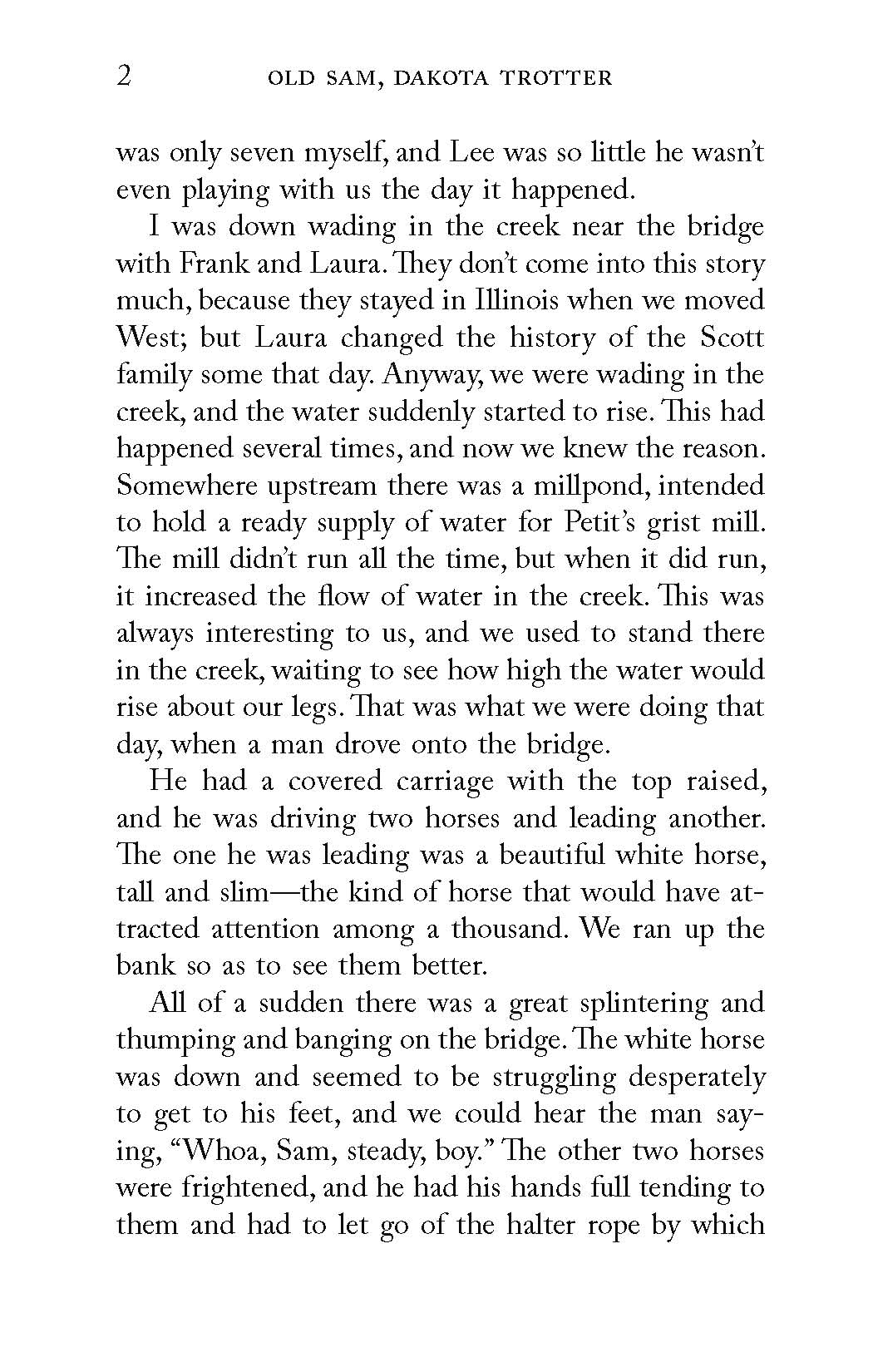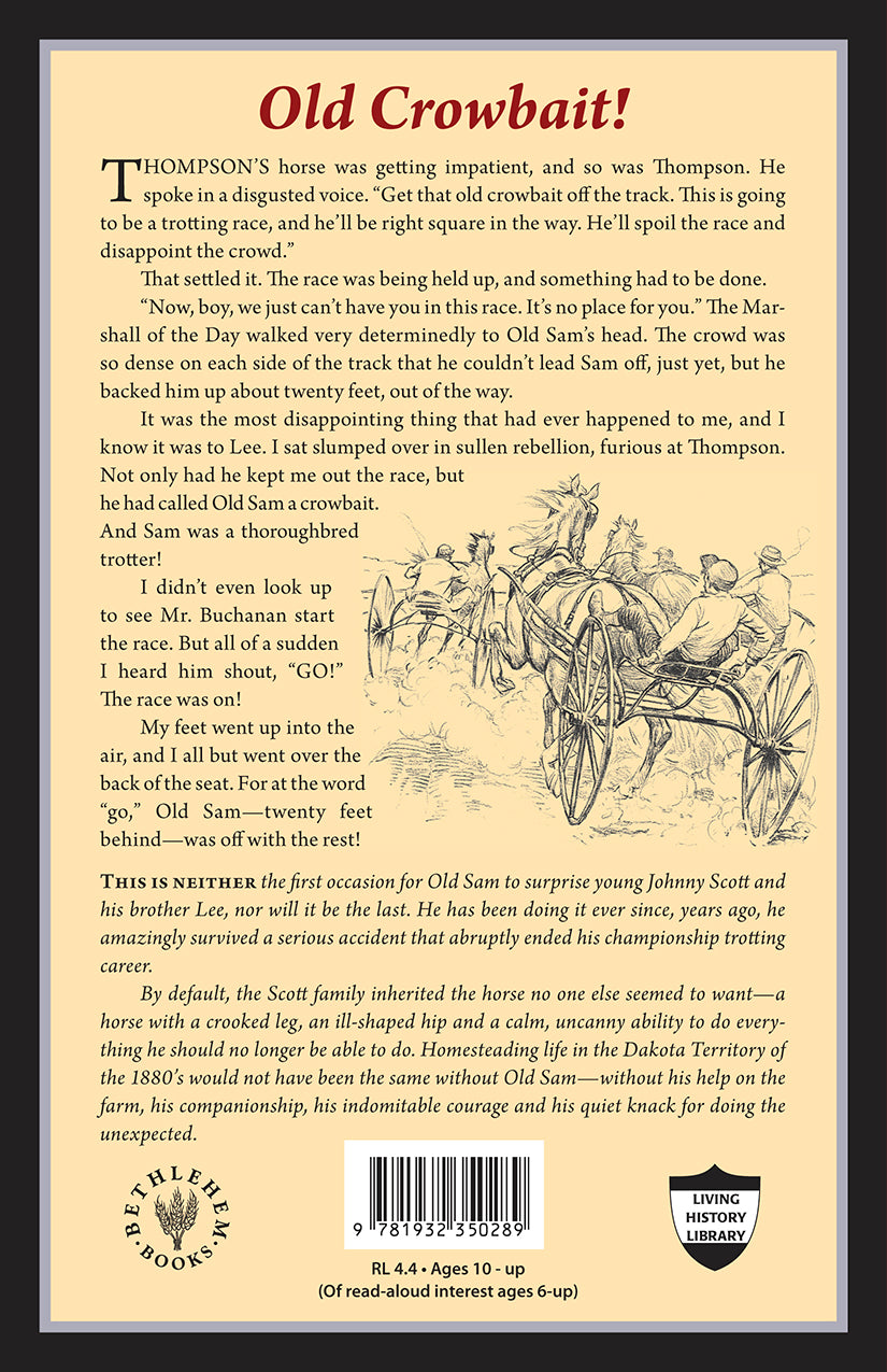 Homesteading in the Dakota Territory of the 1880’s would not have been the same for 10-year-old Johnny Scott and his younger brother, Lee, if they’d had to do it without Old Sam. Years before, a sudden, crippling accident had left Sam, a thoroughbred trotter on his way to championship, in the Scott family pasture—to die or to recover. By default, the Scott family inherits the lamed horse that no one else wants. But Mr. Scott soon discovers Old Sam’s uncanny and invaluable ability to do any task a larger, stronger farm horse can do. His awkward appearance and hidden talents proceed to cause both hilarity and ongoing excitement for these two boys caught up in the fast-changing world of the American Midwest.