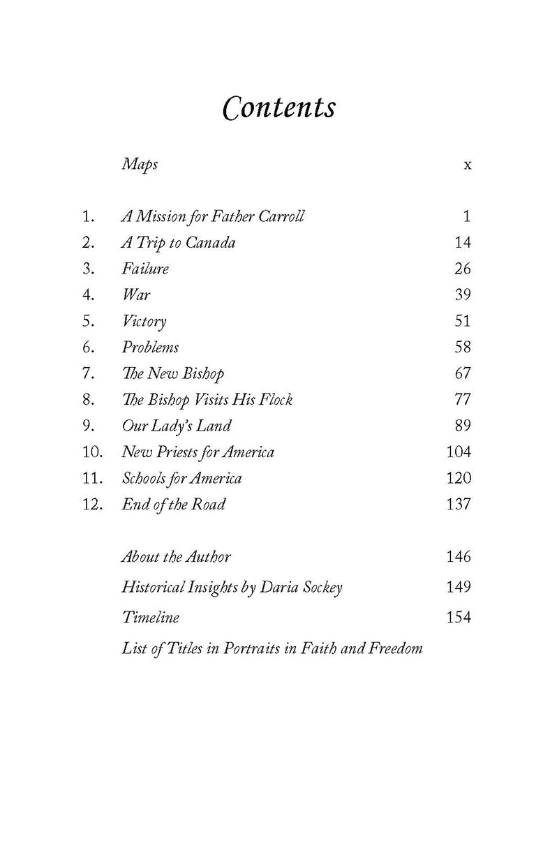 Though independence had been won from England in 1783, and with it greater religious freedom, Catholics in the new United States of America still faced prejudice and fear engendered by decades of anti-Catholicism. Rome needed to find the right man to become the first Catholic bishop in the new republic and Fr. John Carroll was just the one. According to Benjamin Franklin, “Father Carroll is a brilliant man of tact and courtesy; a vigorous man of great physical endurance, he also has unlimited patience.” Bishop Carroll definitely had need of all his gifts. First, while accomplishing the delicate task of building a respectful understanding between the Church he represented and the leadership of the new nation, he began a much-needed seminary to train American priests, also starting schools for educating the people. He patiently instructed hot-headed parishes accustomed to self-governance, and he sought priests for Native Americans. By 1810, Carroll had erected four separate dioceses—New York, Boston, Philadelphia and Bardstown, Kentucky (out of the original all-encompassing Baltimore Diocese)—to care for a growing Church as the young nation itself grew. This book provides a fascinating, behind-the-scenes look at the decisions faced by a wise and unshakable man chosen by God to help the Catholic Church in America flourish.
