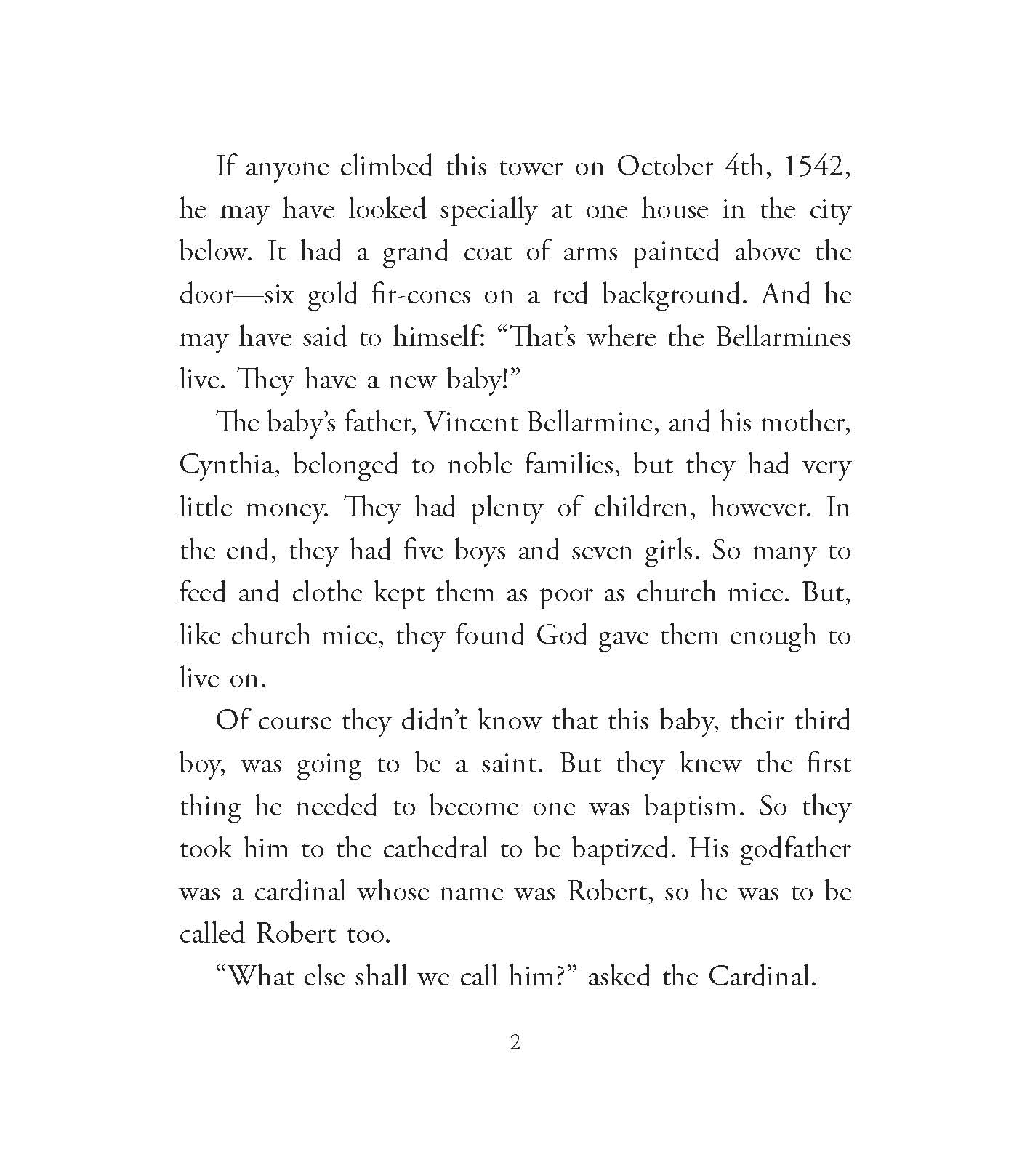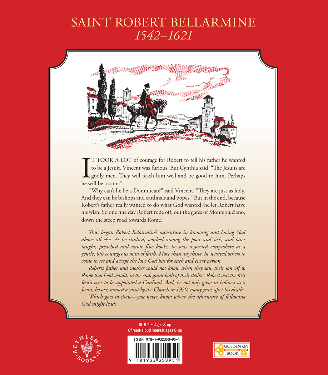 At age fifteen, Robert Bellarmine, a youth with an eager mind and a gift for words, enrolls in a new school run by the young order of Jesuits who have just arrived in his Italian hilltop town. Inspired by the Jesuits’ life of voluntary poverty and refusal of Church honors, Robert enters the Jesuits in 1560 at the age of eighteen. He soon proves himself an effective preacher and teacher employing both humor and intelligence. In some of his pulpits, however, he is so short he needs to stand on a stool to be seen by his listeners. As his teaching and writings become well known in the turbulent disputes between Catholics and Protestants, the Pope begins to rely on him for many important tasks. In the end, being a Jesuit does not protect Robert from receiving Church honors, although he is an unusual cardinal. His care for the poor causes him to be openhanded to the point of giving away his own mattress—twice!