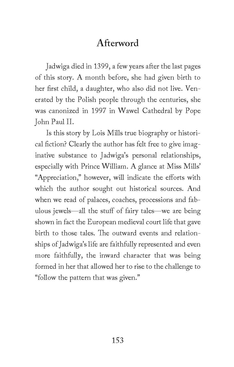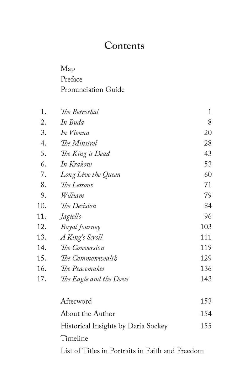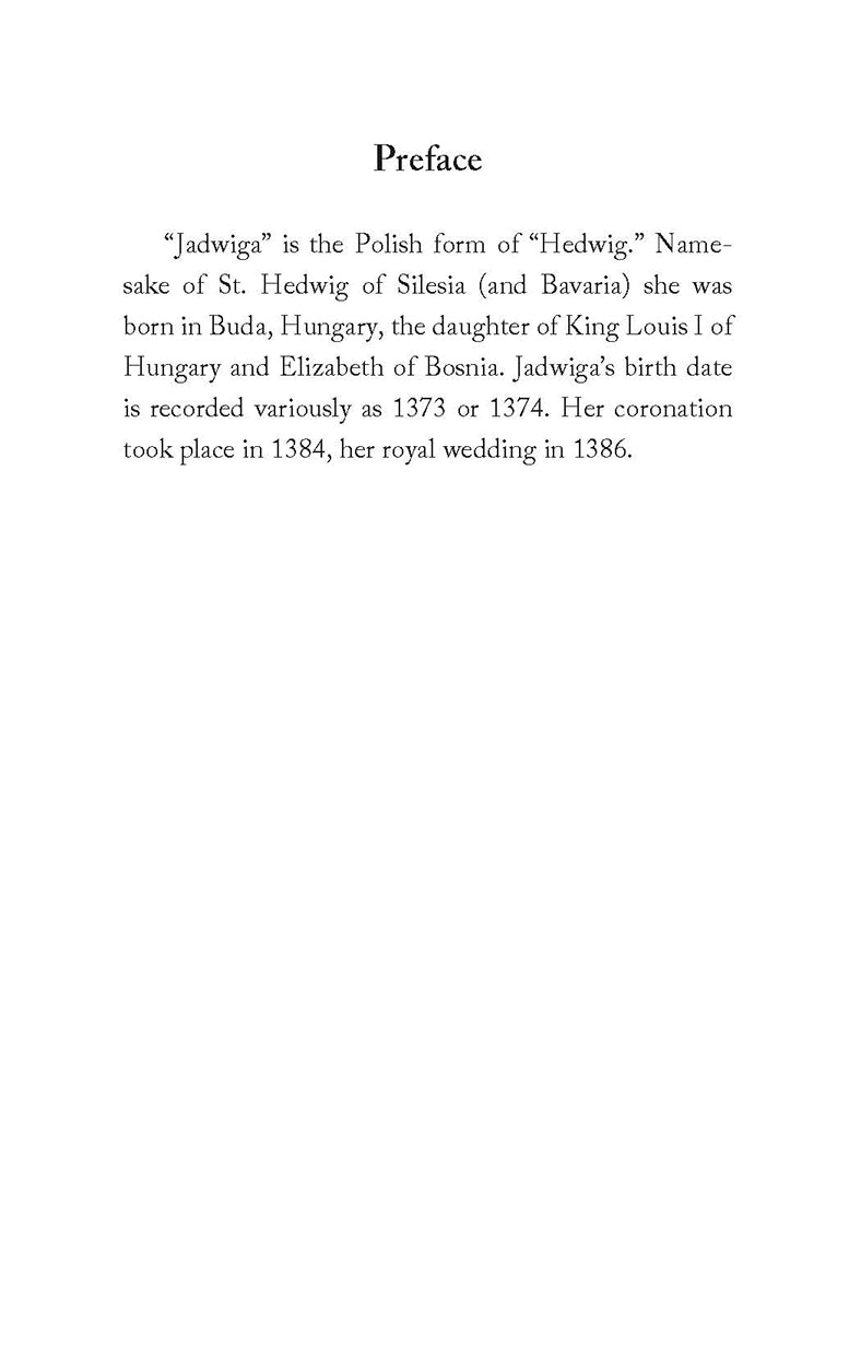 Hungarian Princess Jadwiga (Yahd-VEE-gah) has been prepared from birth to put the peace and prosperity of nations above her own desires. Betrothed in 1378 at the age of five to Prince William of Austria, their education has included spending time in each other’s court for careful training as future rulers. When the balance of power in Central Europe unexpectedly shifts, the Council from faraway Poland demands that Jadwiga become their monarch. The eleven-year-old girl is soon traveling north to Krakow where she is crowned queen in Wawel Cathedral, swearing “to keep and maintain the rights and liberties granted by the righteous Christian kings of Poland.” And she means to do it. However, when Poland’s Council insists upon her marrying the fierce pagan Prince Jagiello of Lithuania instead of William, Jadwiga passionately resists. The intense struggle in which this young queen lays down her personal hopes and gives her entire life to the fulfillment of a peaceful union between Poland and Lithuania—long referred to as “The wedding ring of Jadwiga”—will have far-reaching consequences in her own time and in the years to come. Jadwiga, “White Dove of Poland,” was canonized a saint in 1997 by Pope John Paul II.