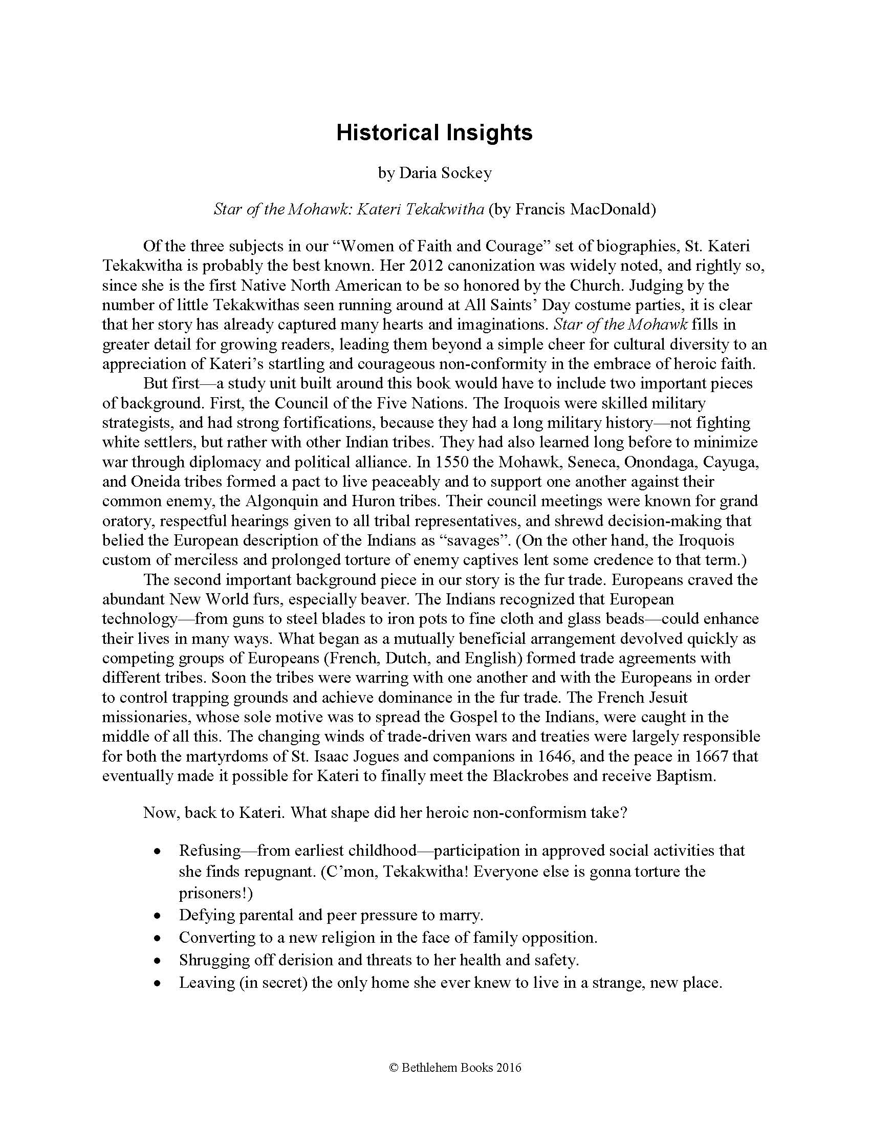 In the 1600s, New France was the arena for both violent upheaval and powerful change. On one hand, longtime enmity between the Mohawk nation of the Iroquois and the Algonquins of New France fuels aggressive competition for the fur trade with Europeans. On the other hand, many Algonquins, as well as those from other tribes, are embracing Christianity and choosing to live along the St Lawrence River in flourishing Christian Indian villages established by the Black Robe missionaries. Kateri Tekakwitha’s mother, an Algonquin Christian, is taken as a captive bride by a Mohawk chief. Thus, from her birth in 1656, Kateri is immersed in the life of the proud Mohawk people, with its intricate roles of women and men, their food, homes, migrations, councils and marriage arrangements. But her acceptance of her mother’s Christian God “Rawennio” puts her at odds with her Mohawk family—especially in her quiet, persistent refusal to marry. After many setbacks, she escapes to the Christian village at “the Sault.” There she is free to learn and live the Christian truths. Her life of consecrated union with Christ becomes a source of light to both her peers and her mentors—a luminance that continues to this day. Canonized on October 21, 2012, Saint Kateri presents a unique glimpse of authentic Christianity to the entire world.