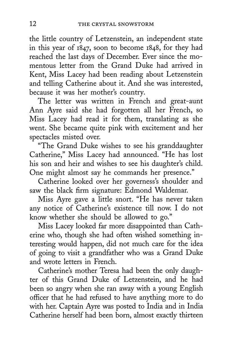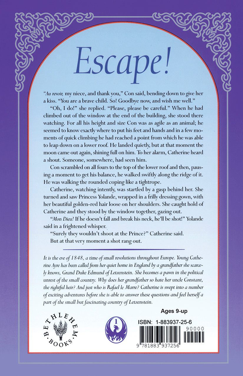 It is 1847, a time of revolutions throughout Europe. Young Catherine Ayre has been called from her quiet home in England by a grandfather she scarcely knows, Grand Duke Edmond of Letzenstein. She becomes a pawn in the political unrest of the small country. Why does her grandfather so hate her uncle Constant, the rightful heir? And just who is Rafael le Marre? Catherine is swept into exciting adventures before she can feel herself a part of the small but fascinating country of Letzenstein.