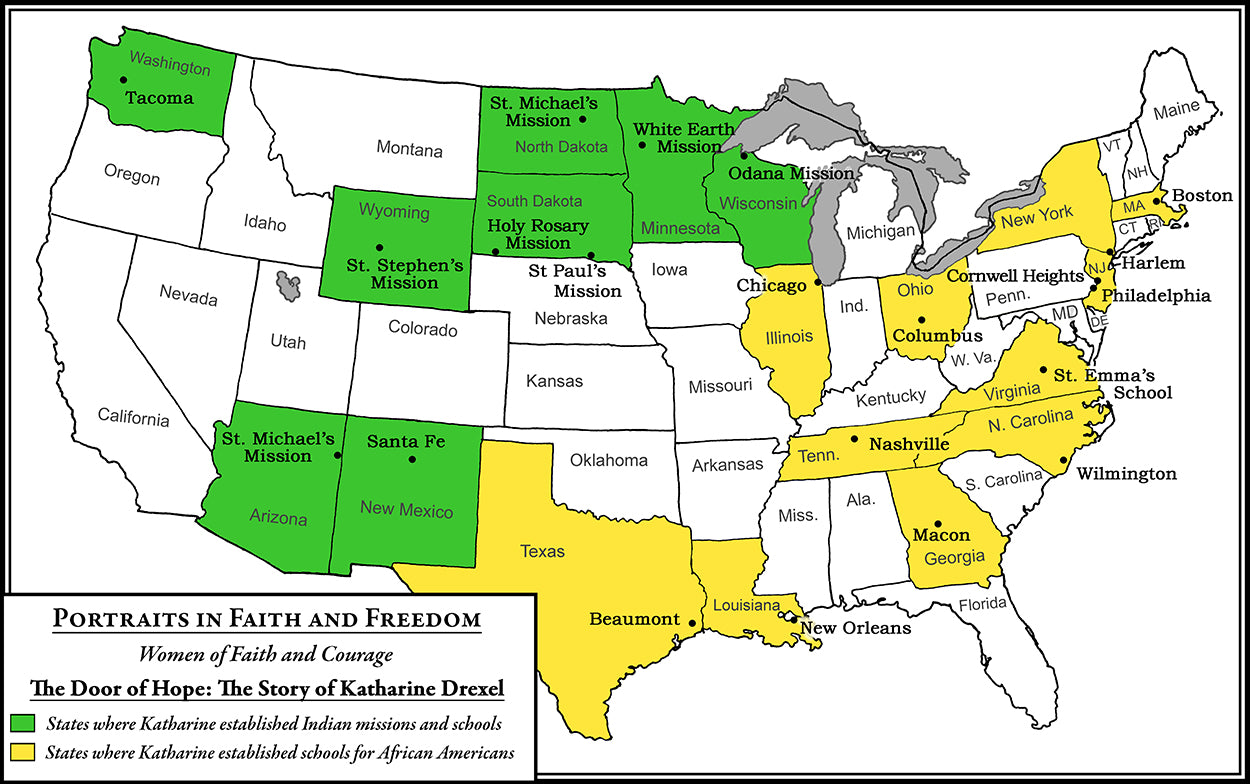 Raised by a wise Philadelphia banker-papa and a loving, devout step-mother, Katharine Drexel is uniquely equipped to confront a distressing failing within the century-old nation of the United States. In the 1880’s, the lack of educational opportunities for Native and Black Americans is appalling, something the Drexels know well because of many close friendships with missionary priests and bishops. Katharine and her sisters, Lizzie and Louise, lose their mother in 1883 and when their father dies in 1885, they inherit his large fortune. Although deeply grieving, they begin at once to use their new wealth as their parents would have desired, with Katharine’s first act an agreement to support Franciscan teachers working in the Dakota Territory. As Lizzie and Louise prepare to marry, Katharine looks to a life of prayer as a contemplative sister. In the end, however, she accepts Pope Leo XIII’s proposal that she both pray and work as a missionary sister. In 1889, at the age of 31, Katharine enters religious life—eventually founding the Congregation of Sisters of the Blessed Sacrament. Through her long life, Katharine tirelessly journeys to establish and maintain schools throughout the United States for American minorities—opening many doors of hope in the face of widespread prejudice and discrimination. This one-time privileged Philadelphia socialite became Saint Katharine Drexel in 2000, 45 years after her death at the age of 97.