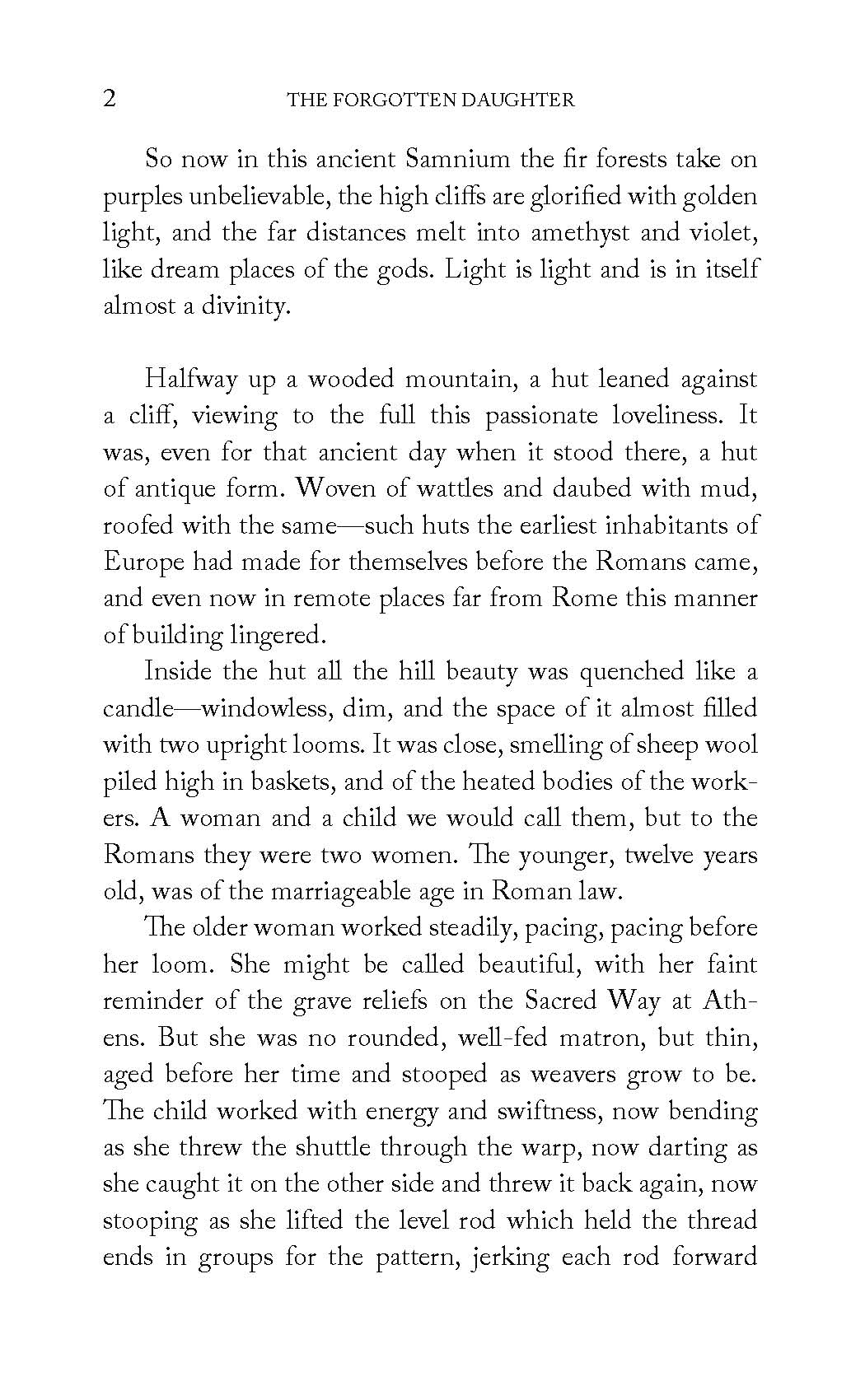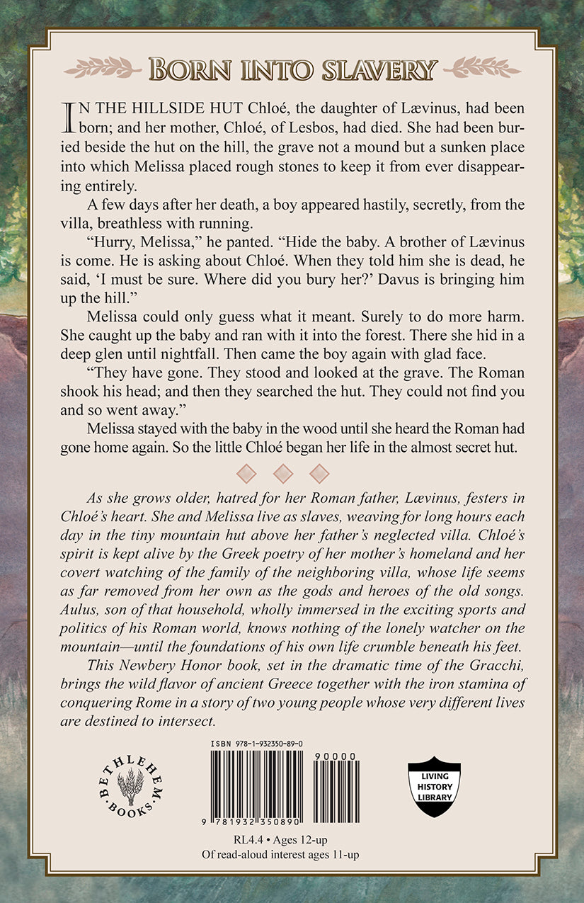 High in the Samnium Mountains of southern Italy, Chloé, daughter of a Roman patrician and his Greek wife, lives as a slave. The mysterious and tragic story of Chloé's birth is told and retold to her by her fellow-slave Melissa, who served her mother and now cares for the young Chloé. But hatred for the father who abandoned her festers in Chloé's heart as she and Melissa weave for long hours each day in the tiny mountain hut above her father's neglected villa—which he has not visited since before Chloé's birth. As she grows older, Chloé's spirit is kept alive by the poetry of Greece, stolen moments in the lovely woodland, and her covert watching of the family of the neighboring villa, whose life seems as far removed from her own as the gods and heroes of the old songs. Aulus, son of that household, wholly immersed in the exciting sports and politics of his Roman world, knows and would care nothing of the lonely watcher on the mountain—until the foundations of his own life crumble beneath his feet. This Newbery Honor book, set in the dramatic time of the Gracchi, brings the wild flavor of ancient Greece together with the iron stamina of conquering Rome in a story of two young people whose very different lives are destined to intersect.