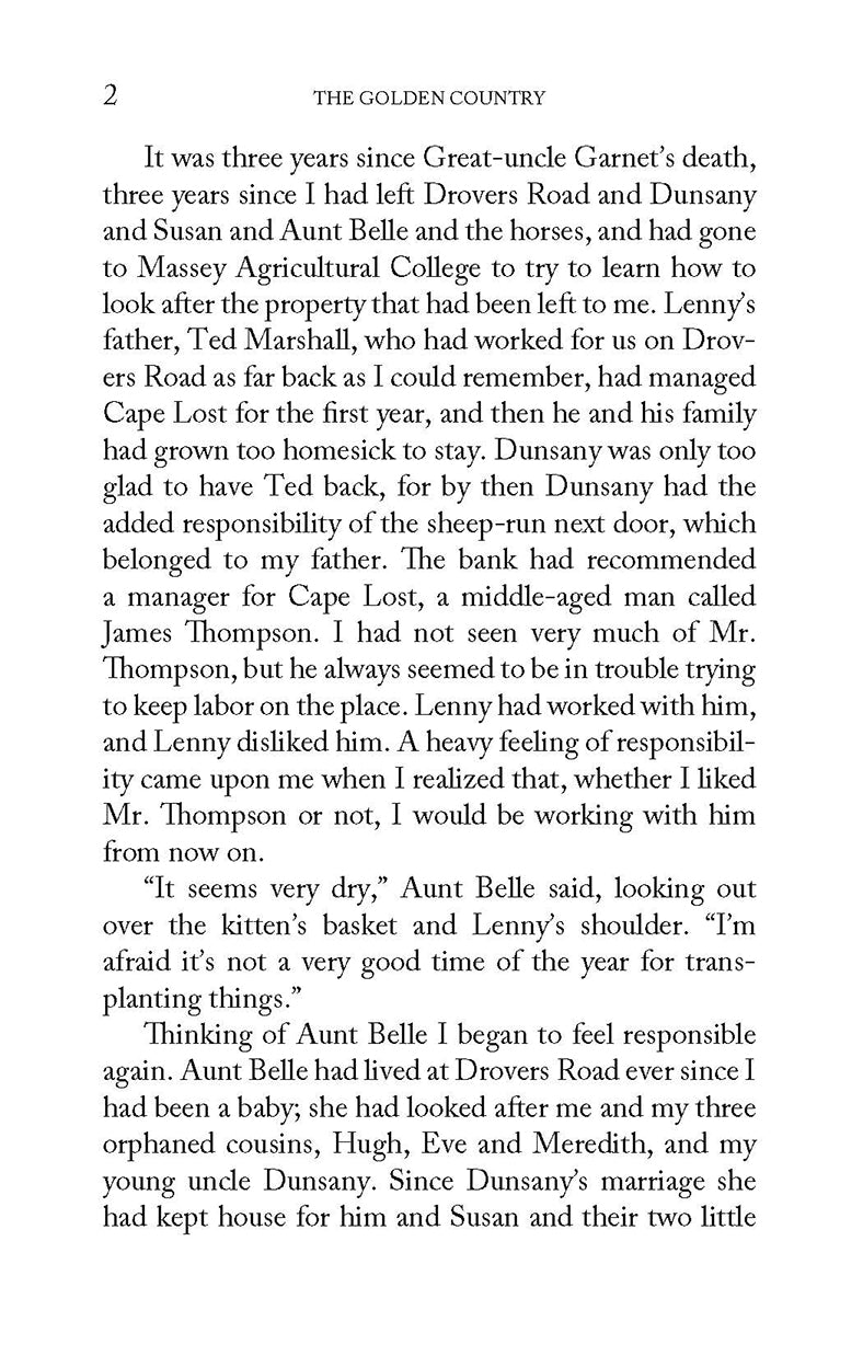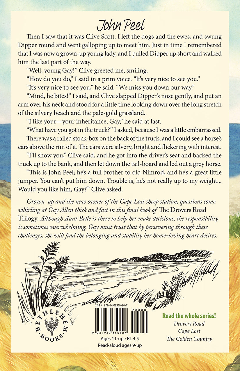 In this last book in the trilogy about Gabrielle Allan, the reader finds Gay and her Great-Aunt Belle about to start a new life in a setting far different from their much-loved Drovers Road. The sheep station of Cape Lost is now Gay’s responsibility and, regardless of her three years’ study at the Massey Agricultural College, both the isolation and tasks ahead seem alarming. Despite its remote and nearly inaccessible location, a surprising cast of new and old characters converge on the station’s windswept, sea-edged expanse. First come the shearing crew—without their cook—just as Gay’s manager quits. When a new manager is finally found, Gay also gains his unhappy daughter and romantically-minded son. While she is glad for steady support of her family—and friends, such as Simon Ware and Clive Scott—Gay must now bear responsibility for her own decisions, the bad as well as the good. Though the landscape of Gay’s world has altered in more ways than one, there is yet the assurance of finding all the belonging and stability her home-loving heart desires.