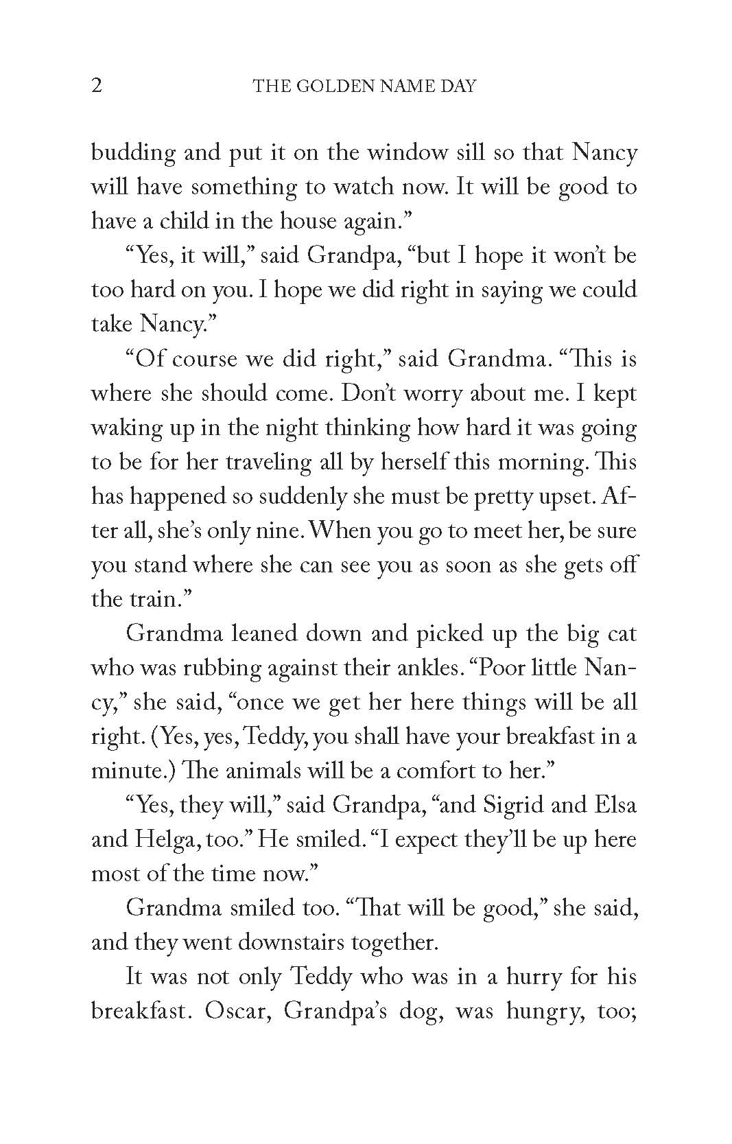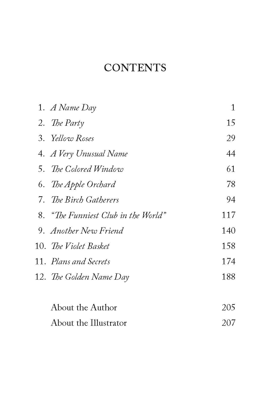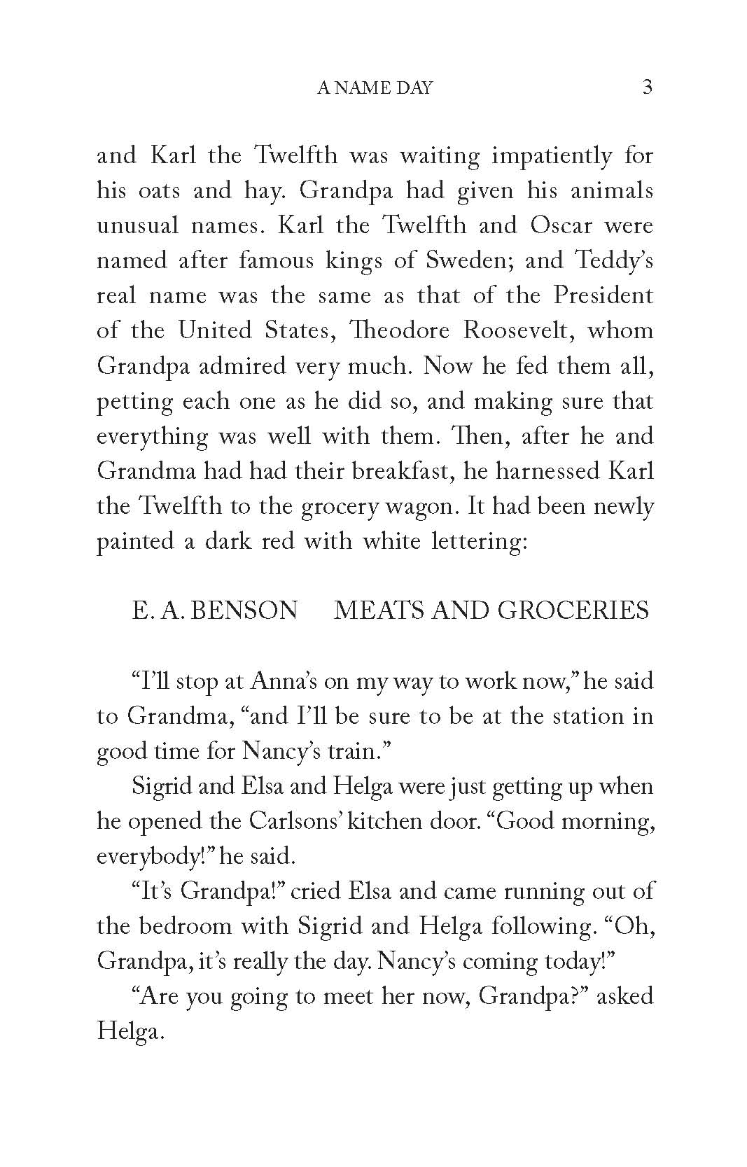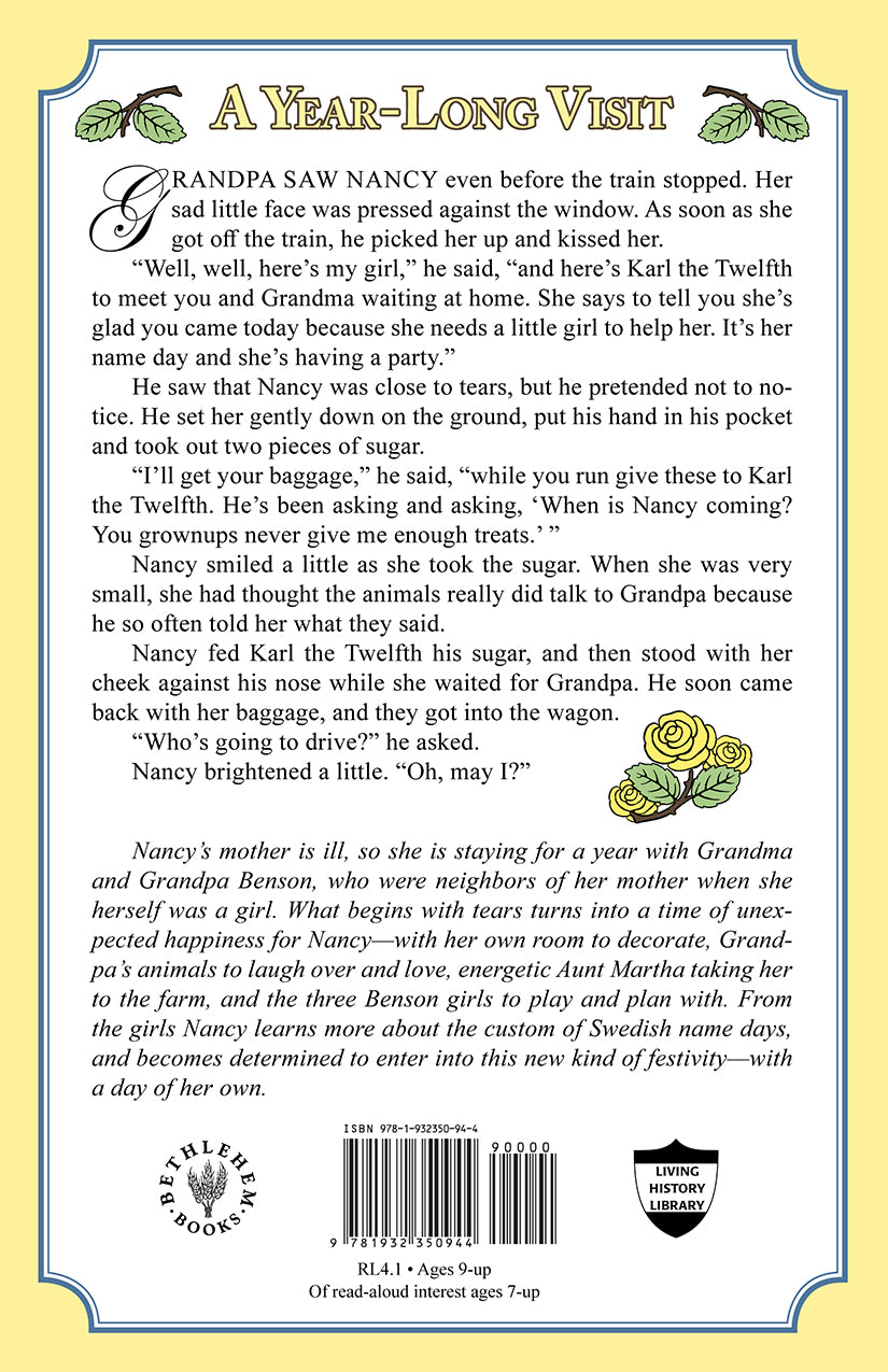 While her mother is recovering from an illness, nine-year-old Nancy travels to her mother’s childhood friends who are like family. “Grandpa” and “Grandma” Benson, together with “Aunt Martha” and young “cousins” Sigrid, Elsa, and Helga, welcome Nancy into their Swedish-American heritage of songs, traditions, and name day parties. Enthralled by the notion of name days, Nancy eagerly looks for her name in the Swedish Almanac, but without success. The Benson family—young and old—rally in search of an answer to her dilemma. In the meantime, Nancy keeps busy meeting the household pets; crafting May baskets with the other girls; taking trips to the farm with Aunt Martha, and helping Grandpa Benson make his “best name day cake ever.” It seems like each week brings new activities to enjoy—but she is no closer to having a name day of her own!