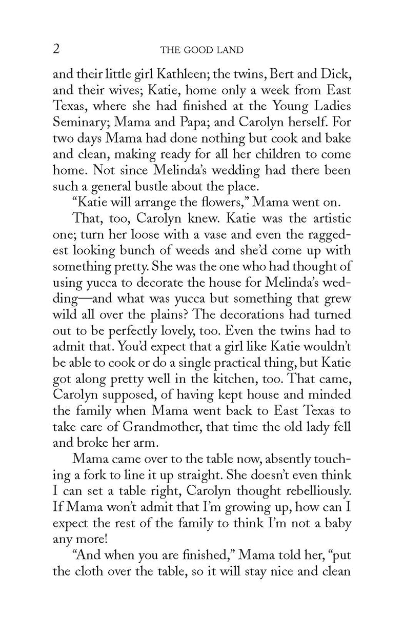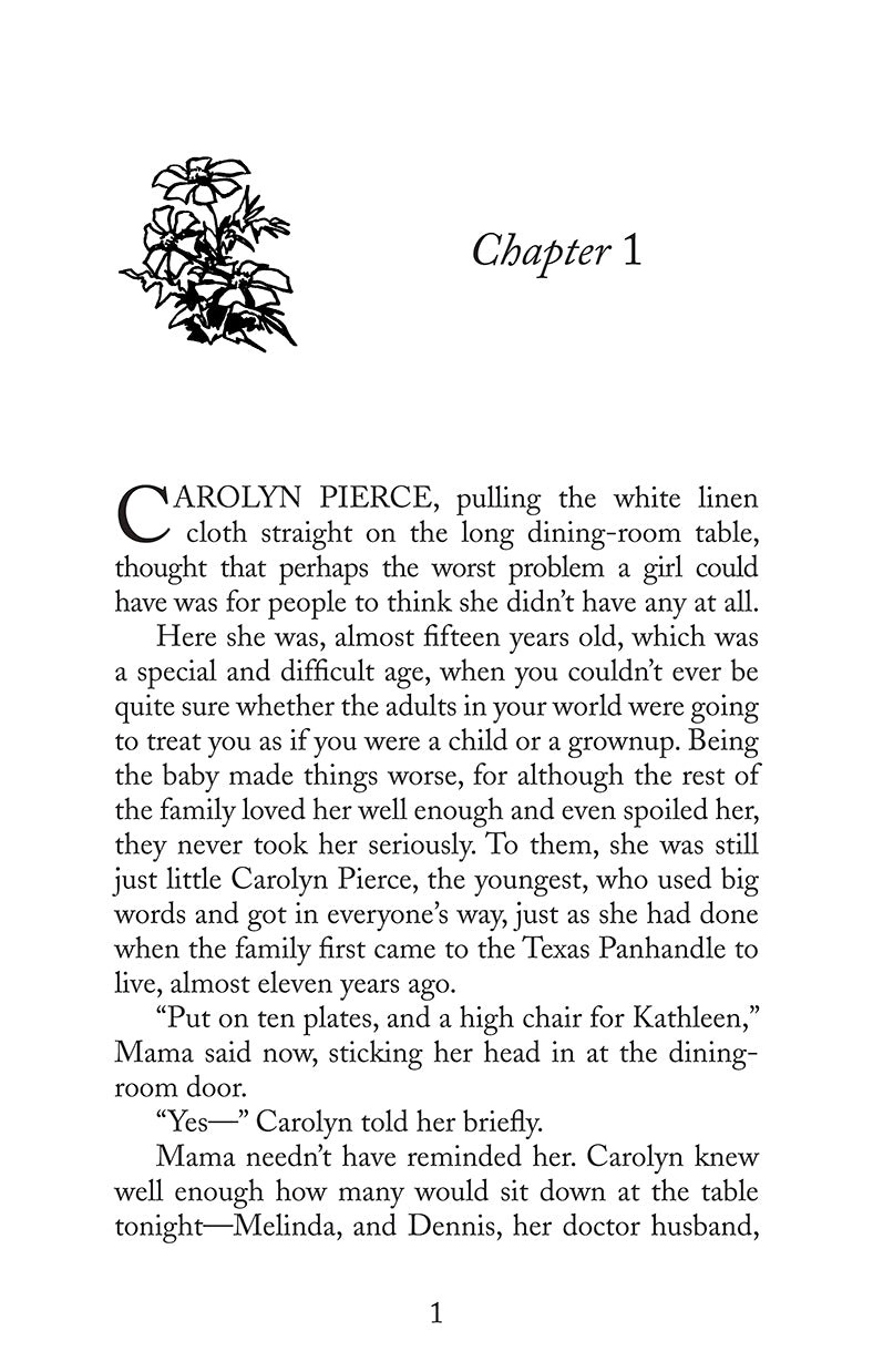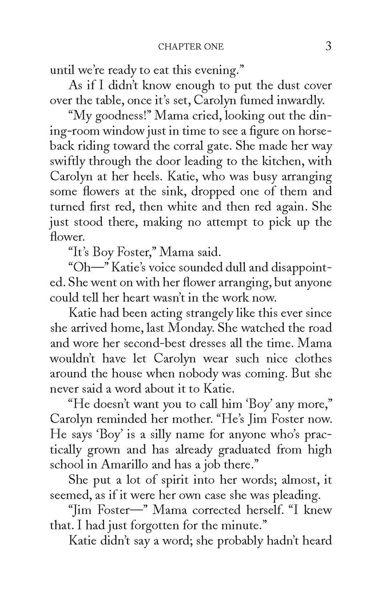 Almost 15-year-old Carolyn, the “baby” of the Pierce family, is experiencing the growing-up difficulties and frustrations typical of the youngest child. Melinda is energetically engaged in the town life of Amarillo, the twins are happily married, and Katie, home from school, spends all day sighing listlessly around the house. Carolyn feels a bit neglected—after all, she has problems and worries, too! In her attempts to find her own place in the adult world, Carolyn tries to assist Katie’s floundering romance, secretly befriends the daughter of an unfriendly homesteader, and discovers that words, her words, can make a difference in others’ lives—particularly in the life of young Jim Foster. The Texas Panhandle is a good land for growing up in—even if the growing up is harder than you expect!