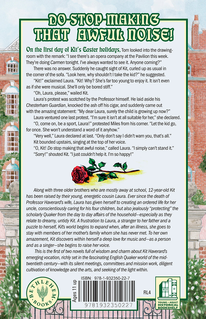 Twelve-year-old Kit Haverard is the only daughter of an absent-minded, scholarly Quaker father. Along with three older brothers who are currently away at school, dreamy, untidy Kit has been raised by their young, energetic cousin Laura. Ever since the death of Professor Haverard’s wife, Laura has given herself to maintaining an ordered life for her uncle, conscientiously caring for his children, but also jealously “protecting” him from the day-to-day affairs of the household. Though Kit is a frustration to her orderly cousin, a stranger to her father and a puzzle to herself, she finds comfort in the realm of make-believe—in books and in time shared with her close friends Pony and Helen. Her world begins to expand when, after an illness, she goes to stay with members of her mother’s family whom she has never met. To her own amazement, Kit discovers within herself a deep love for music and—as a person and as a singer—she begins to raise her voice.