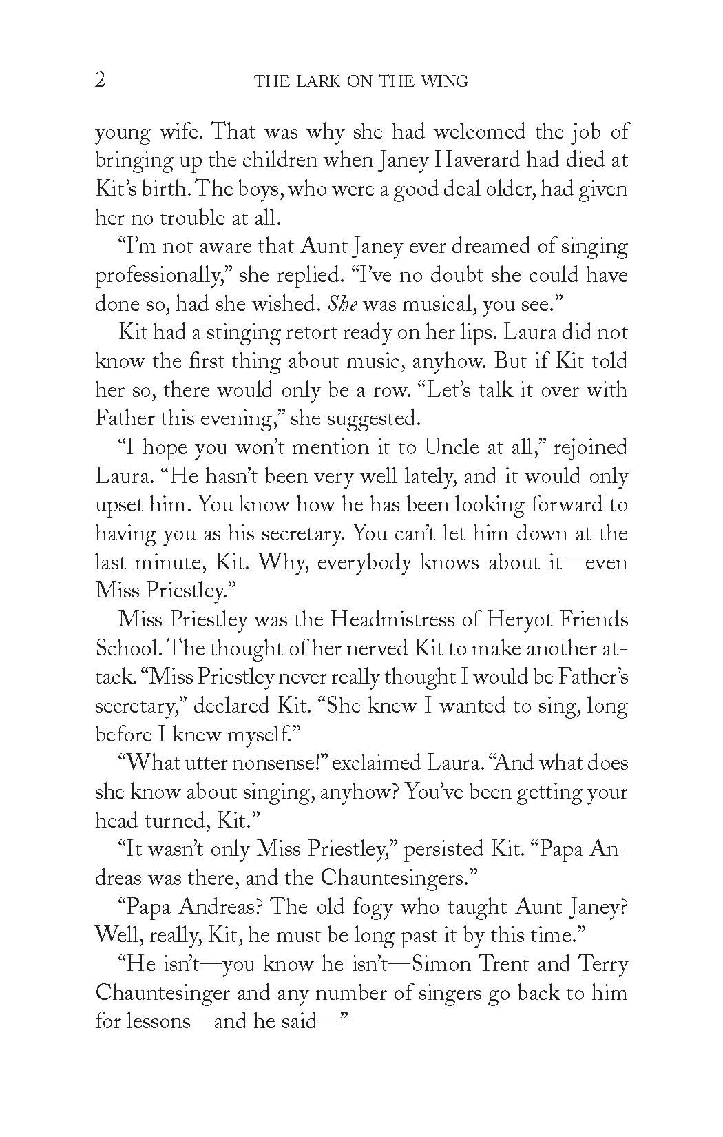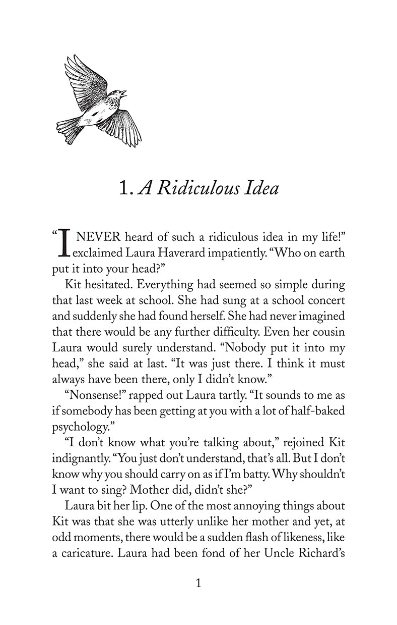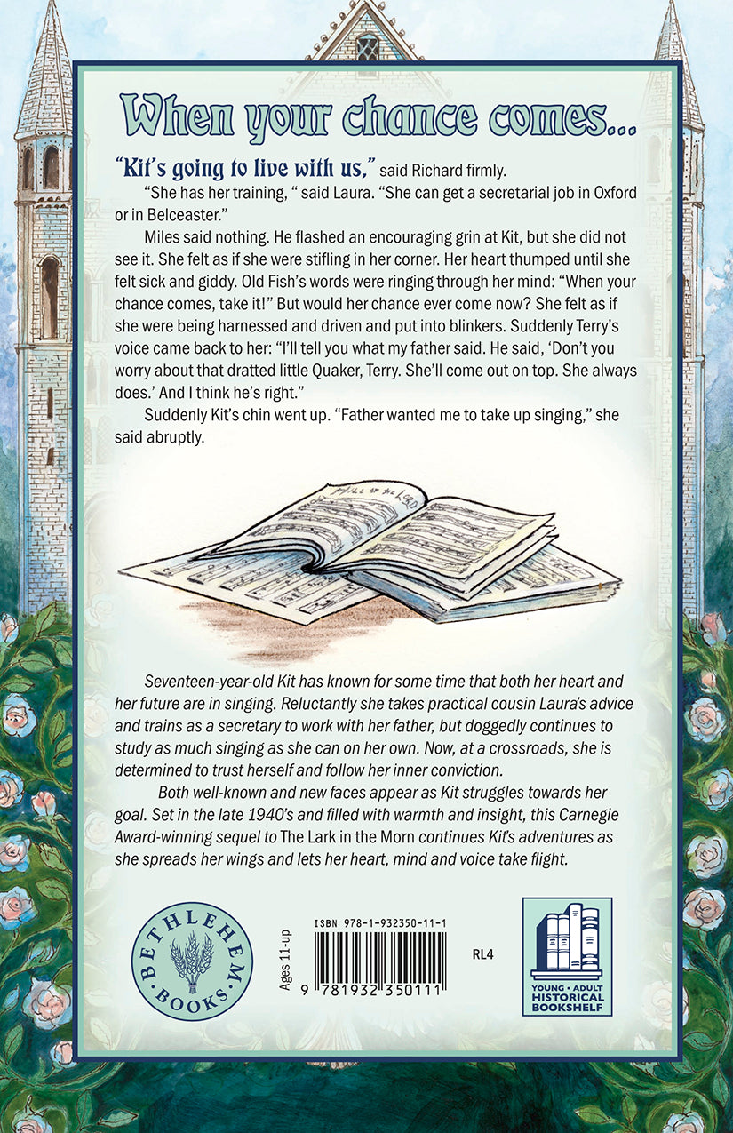Kit finally has recognized that—no matter what—she wants to sing. Only, it comes as a shock to realize that what is at last so obvious to her isn’t as obvious to everyone else. In this Carnegie Award-winning sequel to The Lark in the Morn, seventeen-year-old Kit, once again, is up against her practical cousin Laura, who has helped in the raising of Kit and her three older brothers. Well-intentioned but as clueless as ever with regard to Kit, Laura has better ideas for her than a musical career. Following wise advice, Kit decides to bide her time and enter the secretarial college of Laura’s choice, while studying singing on her own. Doing secretarial work for her remote, scholarly father opens a new door for relationship and understanding between them, and, when life abruptly changes, Kit is ready to stand firm. Both well-known and new faces appear as Kit struggles towards her goal and as the story takes us to London, abroad to France and back again through old familiar settings—to a fitting culmination in the Heryot Cathedral. Set in the 1950’s and filled with warmth and insight, this sequel to The Lark in the Morn continues the adventures of “that dratted little Quaker” as she spreads her wings and lets her heart, mind and voice take flight.