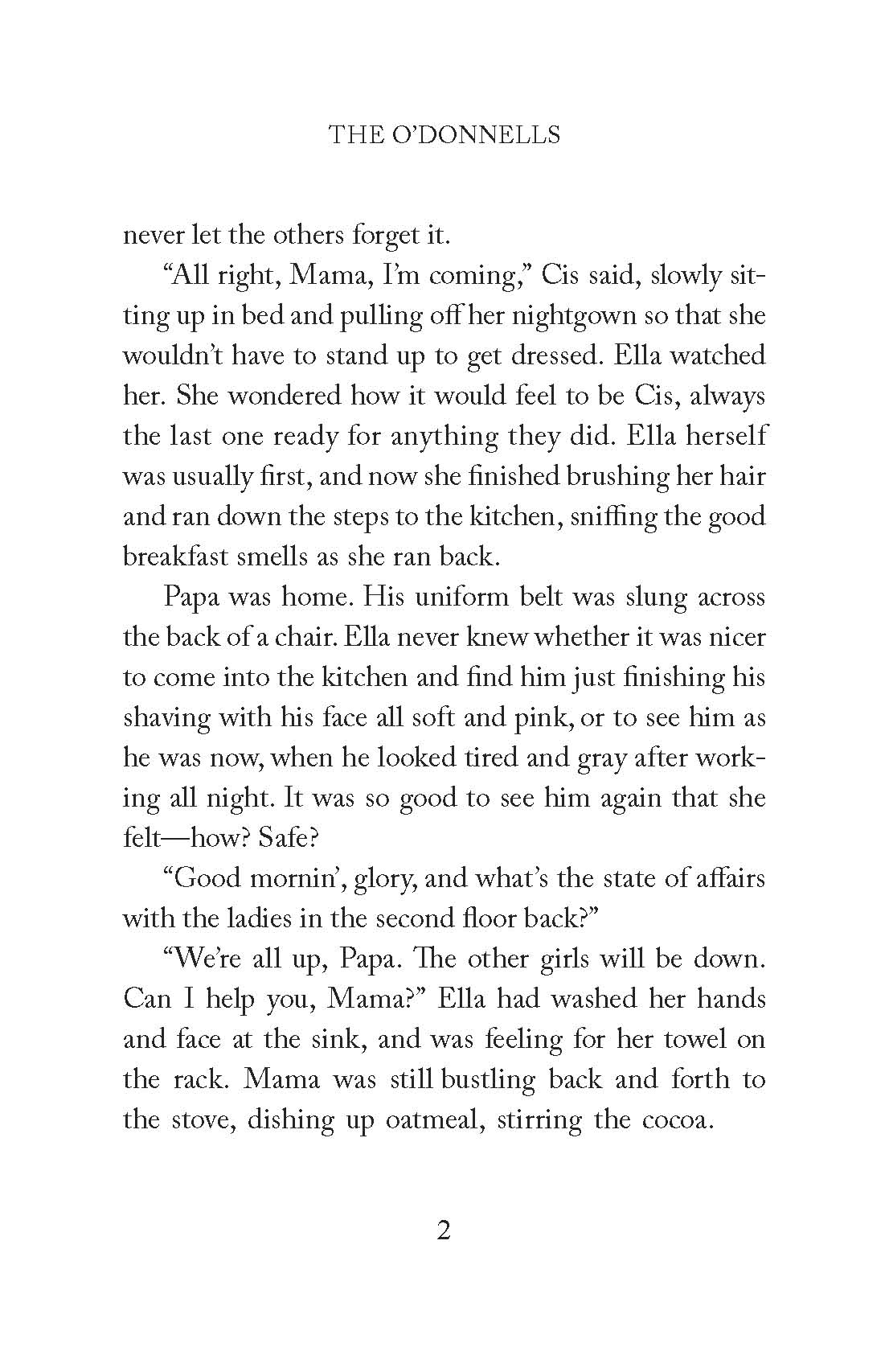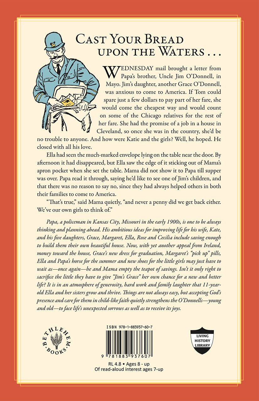 Papa, a policeman in Kansas City, Missouri in the early 1900s, is one to be always thinking and planning ahead. His ambitious ideas for improving life for his wife, Kate, and his five daughters, Grace, Margaret, Ella, Rose and Cecilia include saving enough to build them their own beautiful house. Now, with yet another appeal from Ireland, money toward the house, Grace’s new dress for graduation, Margaret’s “pick up” pills, Ella and Papa’s horse for the summer and new shoes for the little girls may just have to wait as—once again—he and Mama empty the teapot of savings. Isn’t it only right to sacrifice the little they have to give “Jim’s Grace” her own chance for a new and better life? It is in an atmosphere of generosity, hard work and family laughter that 11-year-old Ella and her sisters grow and thrive. Things are not always easy, but accepting God’s presence and care for them in child-like faith quietly strengthens the O’Donnells—young and old—to face life’s unexpected sorrows as well as to receive its joys.