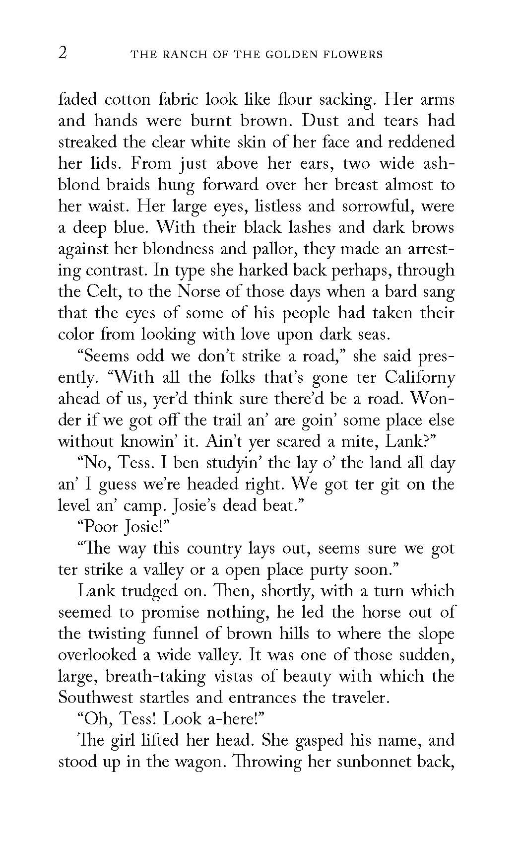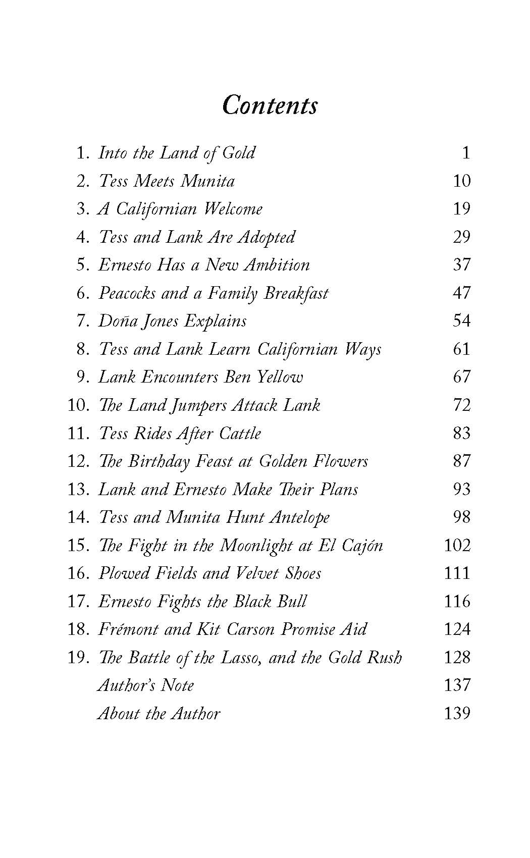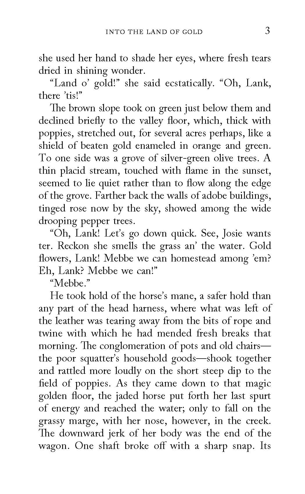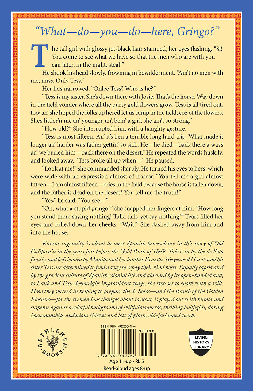 Kansas ingenuity and determination meets Spanish grace and benevolence in this story of Old California in the years just before the Gold Rush of 1849. The wagon which has carried sixteen-year-old Lank and his younger sister Tess across the plains, mountains and desert, through sickness, misery and near death, falls to pieces on the edge of La Hacienda de las Flores de Oro—The Ranch of Golden Flowers. Taken in by the generous de Soto family, and befriended by Munita and her brother Ernesto, the recently orphaned young people desire to find a way to repay their kind hosts. Both captivated by the gracious culture of Spanish colonial life and alarmed by its open-handed and, to Lank and Tess, outright improvident ways, the two set to work with a will. How they succeed in helping to prepare the de Sotos for the great changes ahead is engagingly played out against the colorful background of Old Californian life at its height.
