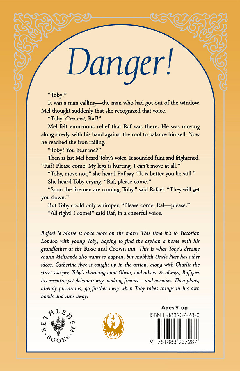 Melisande, a girl with actors’ blood in her veins, finds life dreary; her family runs a London inn, “The Rose and Crown.” Then, in November 1849, Rafael le Marre arrives, bringing Mel’s lost cousin Toby with him. Unexpected experiences swirl in Rafael’s wake: Mel meets Catherine Ayre and mischievous Charley the sweeper. Meanwhile, Raf stirs up the trouble that is native to his frank character. Several necessary resolutions must occur before Raf and company set out again for Letzenstein.