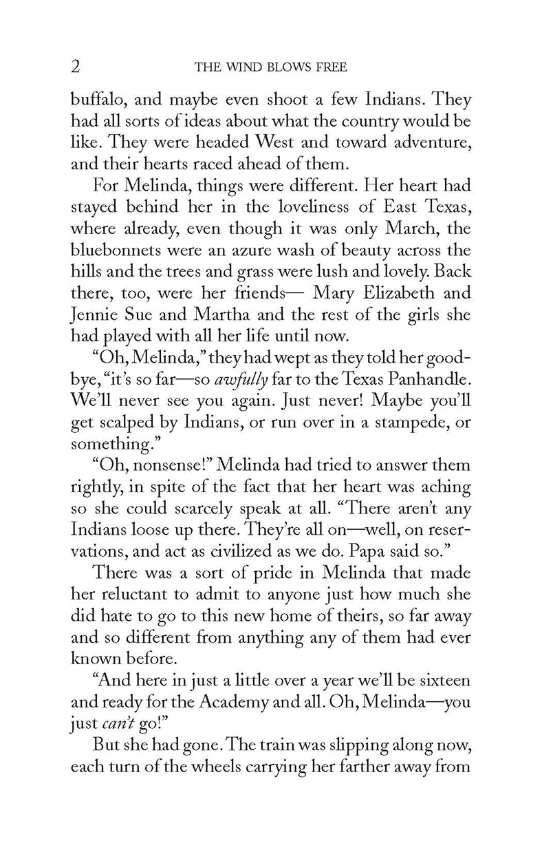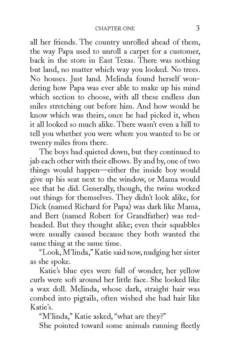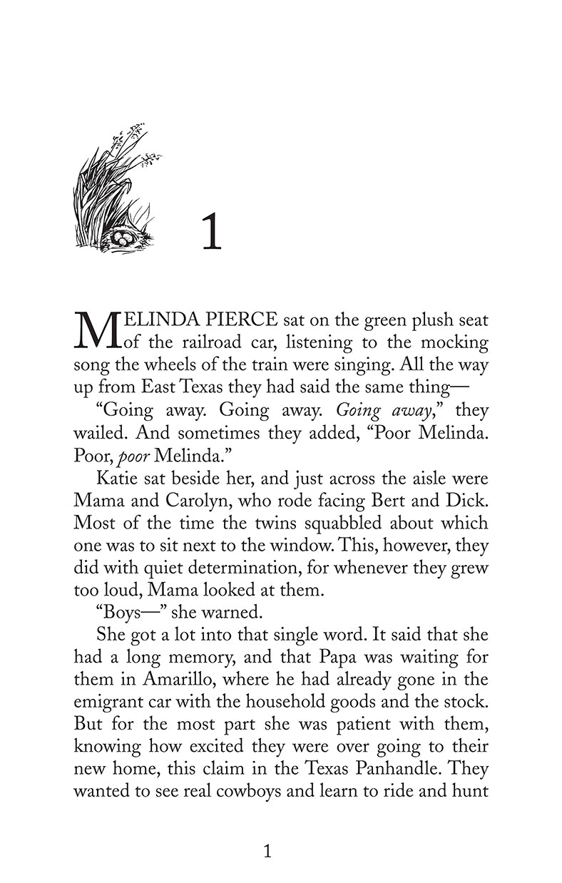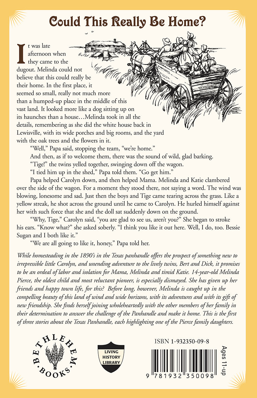 Homesteading in the 1890’s: The Texas Panhandle was only just beginning to be homesteaded by farmers—called “nesters.” Forced to give up his store in East Texas, Mr. Pierce introduces his family to the daunting challenge of life in a sod hut on the windswept plain. While the move offers a prospect of something new to irrepressible little Carolyn and unending adventure to the lively twins, Bert and Dick, it promises to be an ordeal of labor and isolation for Mama, Melinda and timid Katie. 14-year-old Melinda Pierce, the oldest child and most reluctant pioneer, is especially dismayed. She has given up her friends and happy town life, for this? She clings tightly to her grandmother’s promise that when Melinda is 16 she may return to East Texas and join her friends at Lewisville Academy for Young Females. It is this hope, and her mother’s dauntless example, which get Melinda through the first difficult weeks. Before long, however, Melinda is caught up in the compelling beauty of this land of wind and wide horizons, with its adventures and with its gift of new friendship. She finds herself joining wholeheartedly with the other members of her family in their determination to answer the challenge of the Panhandle and make it home. This is the first of three stories about the Texas Panhandle, each highlighting one of the Pierce family daughters.
