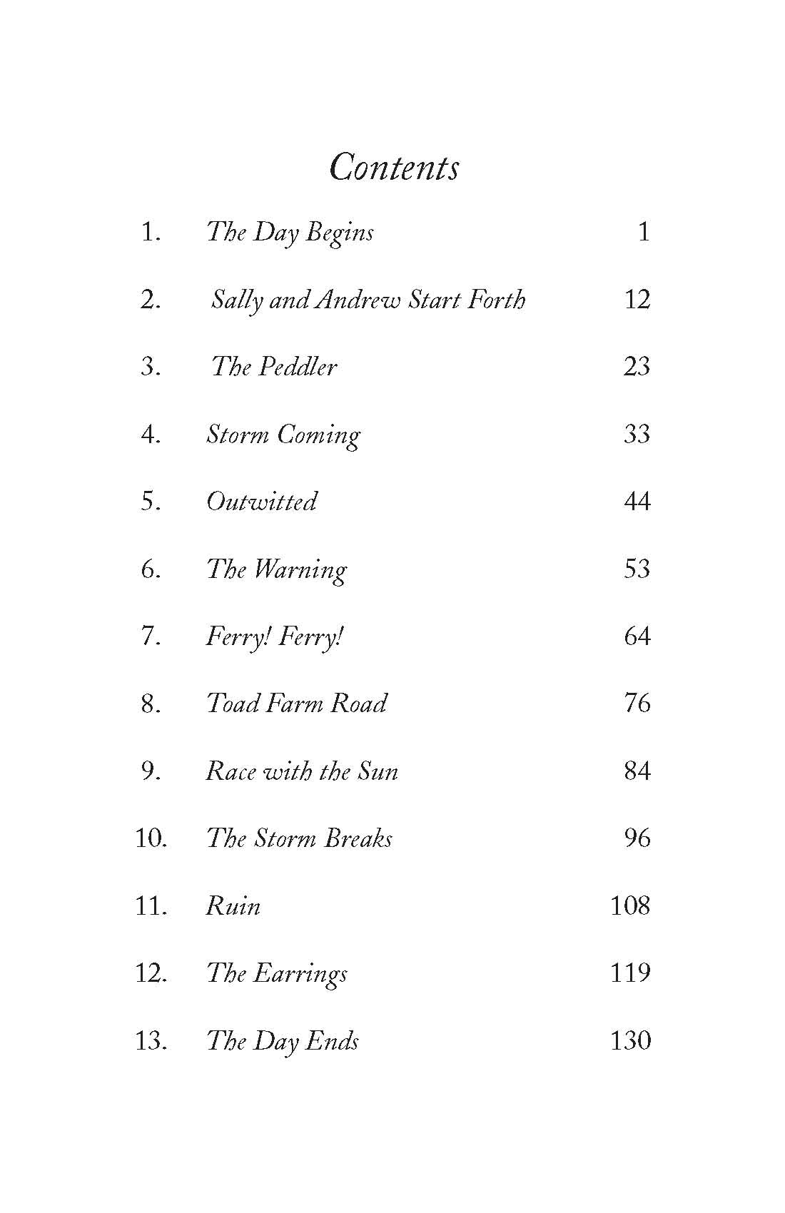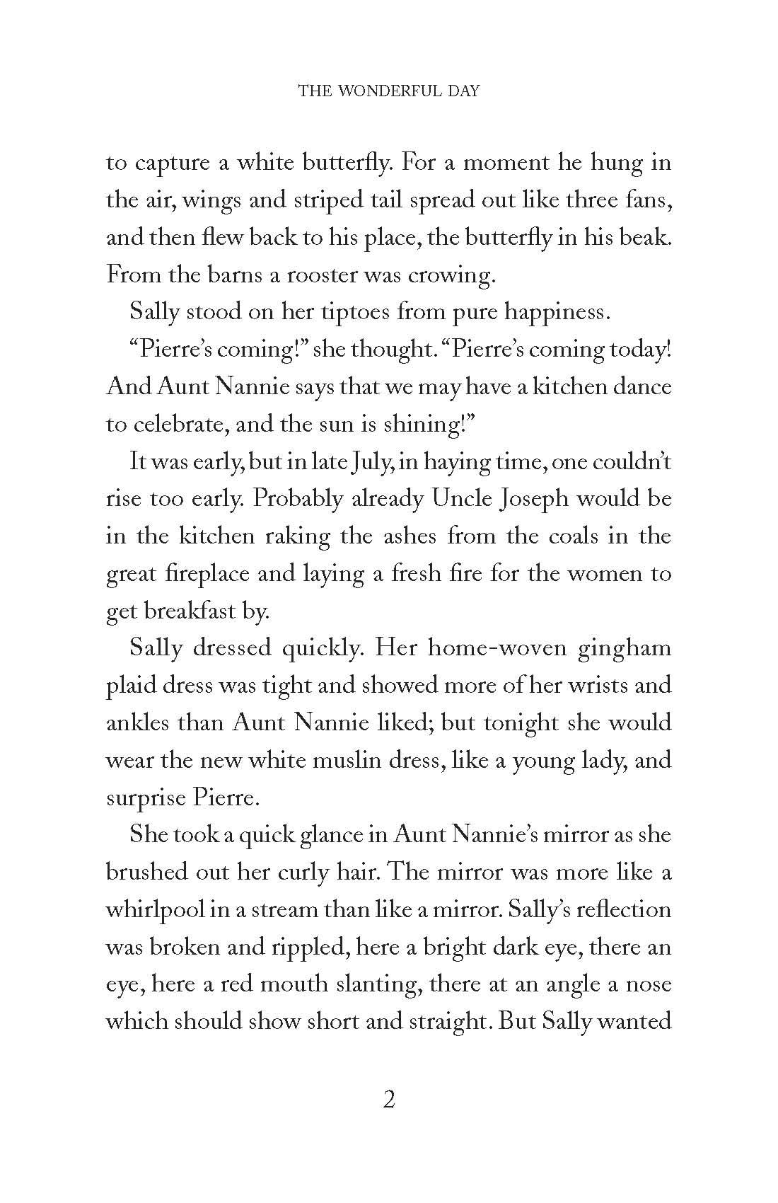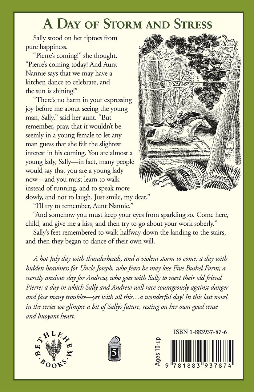 A hot July day with thunderheads, and a violent storm to come; a day with hidden heaviness for Uncle Joseph, who fears he may lose Five Bushel Farm; a secretly anxious day for Andrew, who goes with Sally to meet their old friend Pierre; a day in which Sally and Andrew will race courageously against danger and face many troubles—yet with all this…a wonderful day! In this last novel in the series we glimpse a bit of Sally’s future, resting on her own good sense and buoyant heart.