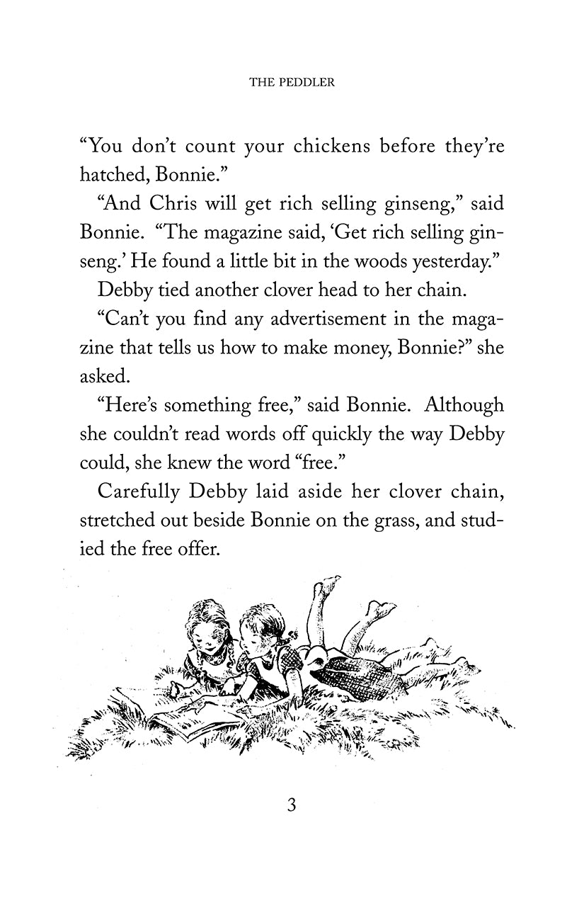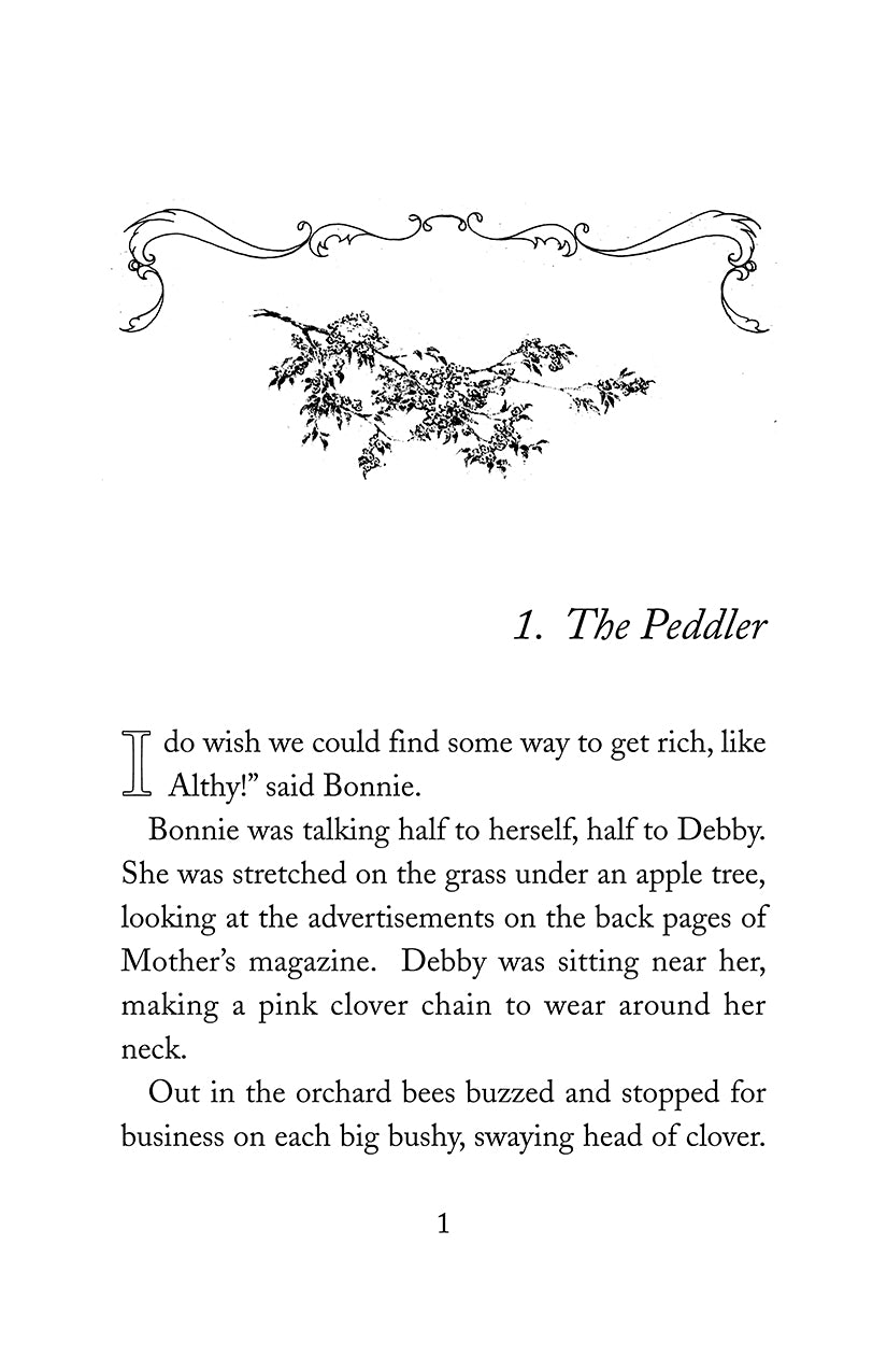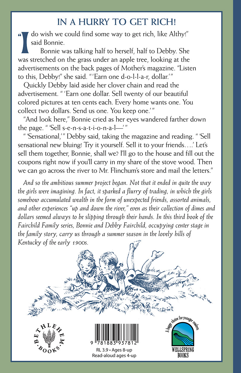 Bonnie and Debbie’s desire to get rich causes them to respond to a sure-thing magazine advertisement. They are soon embarked upon an ambitious summer of selling “up and down the river.” Not that circumstances end quite in the way they had imagined! In a surprising flurry of trading, the girls somehow accumulate wealth in the form of unexpected friends, assorted animals, and unforeseen situations, even as their collection of dimes and dollars seem always to be slipping through their hands. Bonnie and Debbie Fairchild occupy center stage in this story of a summer season in the lovely hills of Kentucky of the early 1900’s.
