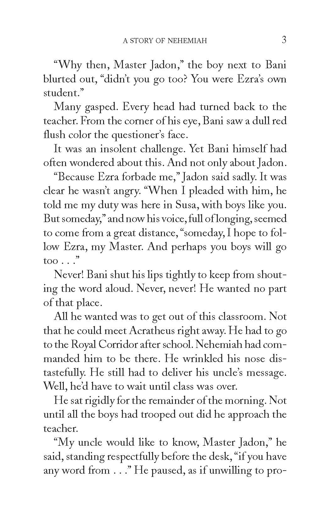 Thirteen-year-old Bani, though born in Jerusalem, has lived from infancy with his uncle in beautiful Susa, the city of the Persian King Artaxerxes. Now, his Uncle Nehemiah wants to leave his position of high honor as Cupbearer to the King to return to Jerusalem, a city in ruins and beset by every kind of trouble! Nehemiah’s request of the king, permission to return to help his own people, could so easily—in an empire riddled with political intrigue—be misconstrued as treasonous scheming. Bani himself is given an unexpected part to play, the outcome of which is to forever change his life. Seen through the eyes of Bani, this novel dramatizes a turning-point of history, in 445 BC, when—through confrontation and daring risks—Judaism was re-established in the Promised Land, and purified for her unfolding mission.